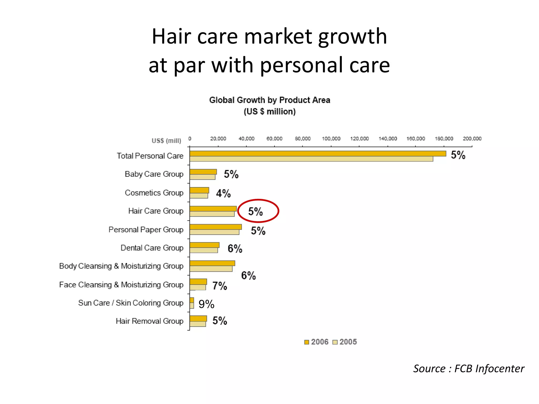 The document discusses key learnings from the international shampoo market. It finds that conditioners are the fastest growing category after shampoos, with the market growing at 9% annually. Major brands are differentiating through novelty, like Herbal Essences' redesign and Sunsilk's $200M launch supported by TV ads. Brands are also focusing messaging on how their products achieve beautiful hair through benefits like preserving natural beauty and improving hair condition. Six main consumer mindsets were identified, ranging from those seeking basic products to indulgence to specific treatments. Overall, the market shows a large value segment but an emerging premium one, with consumers continuously evolving in their expectations around product and media innovation to achieve beautiful hair.