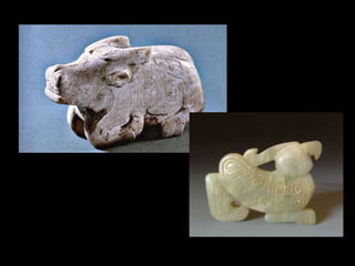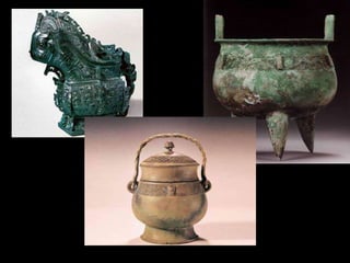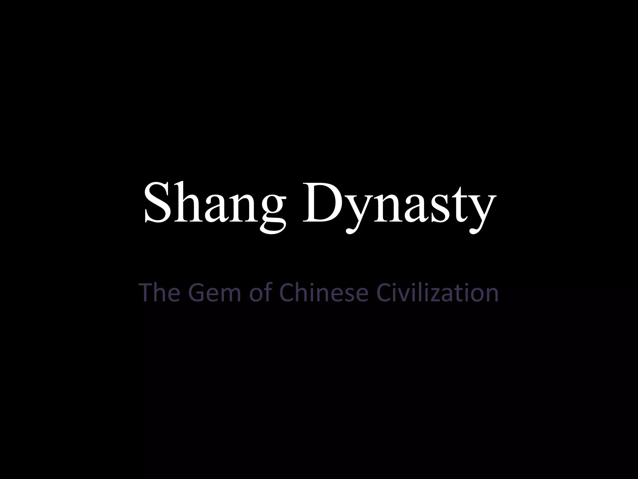 The Shang Dynasty was China's first literate civilization and ruled from around 1600-1046 BCE. They developed advanced bronze-working, bureaucracy, and rammed earth walls. The Shang heartland was along the Yellow River and traditionally dates from 1766 BCE when it was founded by Cheng Tang until its defeat by the Zhou at the Battle of Muye in 1045 BCE. The Shang made significant cultural contributions such as developing writing, bronze-working, and leaving behind oracle bones used for divination.