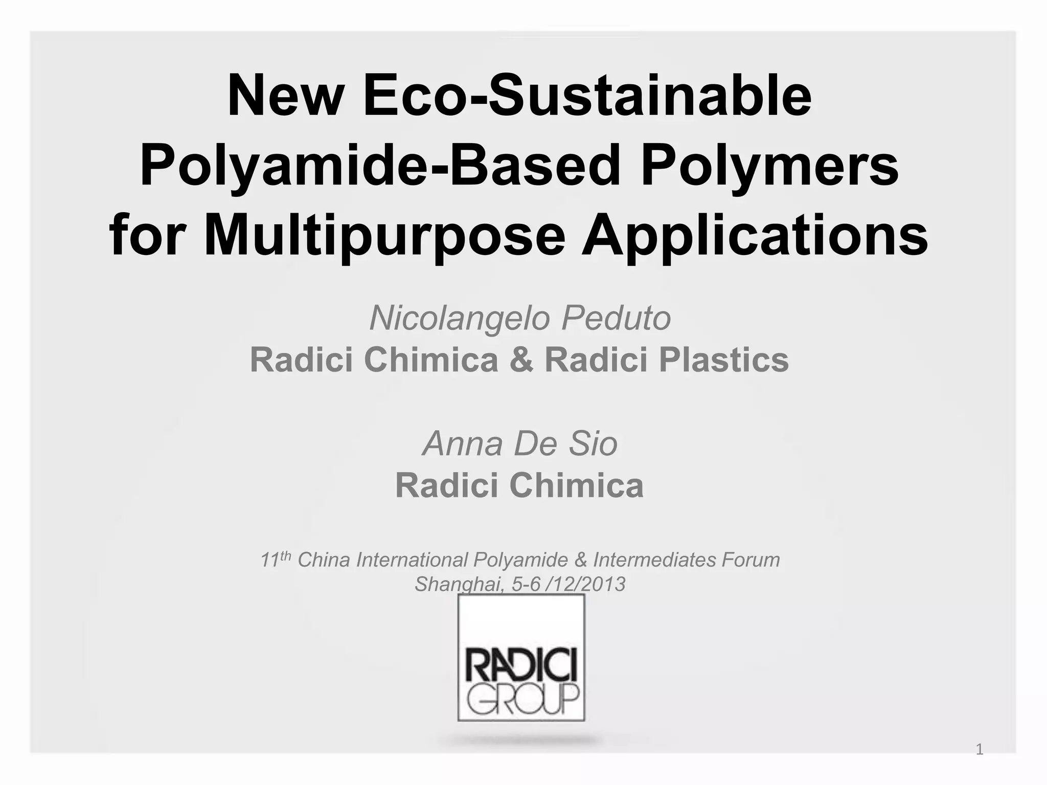 The document presents new eco-sustainable polyamide-based polymers, specifically Radipol® DC PA6.10, developed by Radici Group for various applications. It highlights the polymer's superior properties such as reduced carbon footprint, chemical resistance, impact resistance, and dimensional stability compared to traditional polyamides like PA6 and PA66. Additionally, case studies demonstrate the polymer's performance in industrial applications, emphasizing its advantages in durability and environmental sustainability.