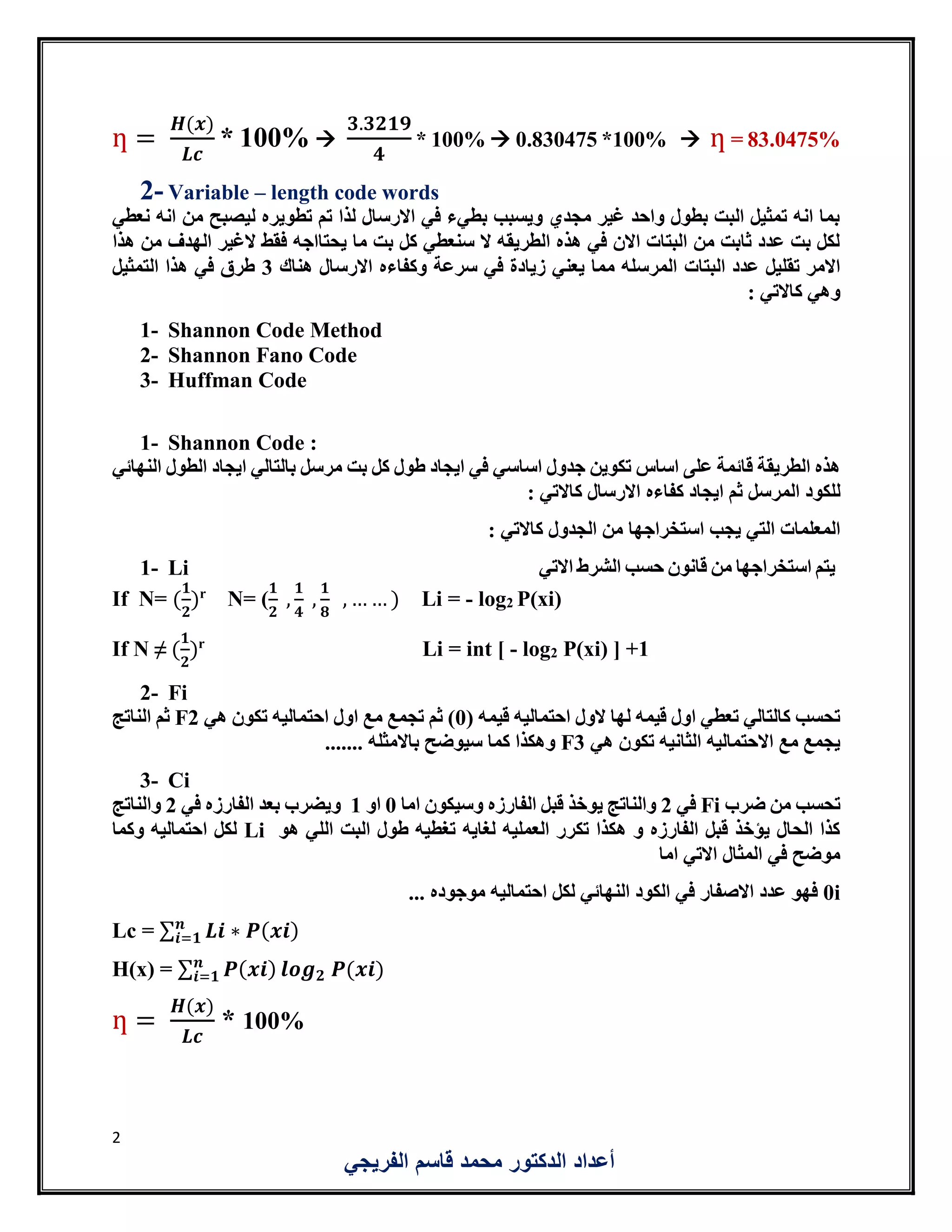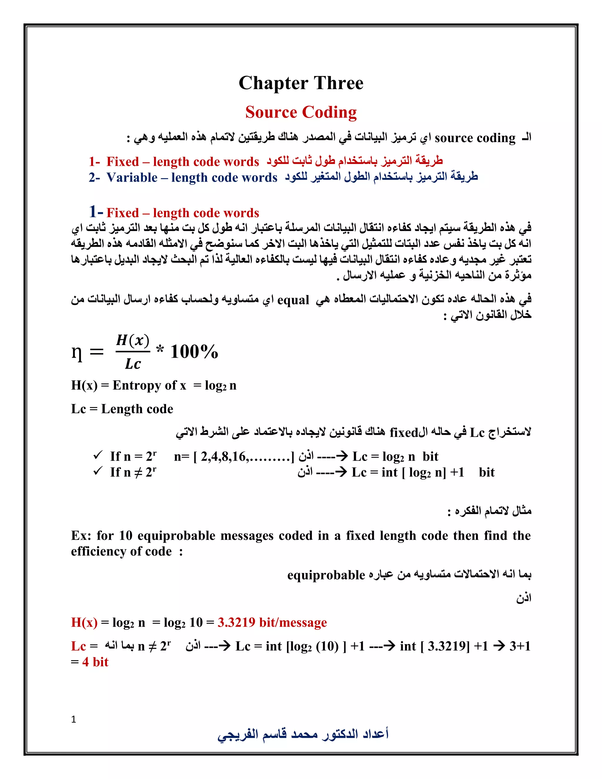 الوثيقة تتناول تقنيات ترميز المصدر، موضحة طريقتين رئيسيتين وهما الكود الثابت والطول المتغير. يتم تفصيل كيفية حساب كفاءة الترميز من خلال معيار شانون، مع تطبيقات عملية تعزز فهم القارئ. كما تتضمن الوثيقة أمثلة رياضية توضح كيفية استخدام هذه التقنيات في إرسال البيانات بكفاءة عالية.