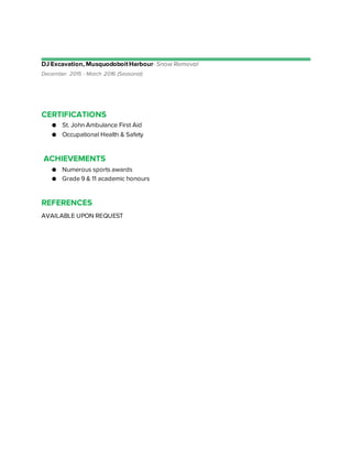 This document is a resume for Shannon Salter that provides her contact information, education history, work experience, certifications, and availability of references. She is currently studying to become a pharmacy technician at Eastern College in Halifax and graduated from high school in 2016. Her work experience includes cashiering at Toulany's Pizza, operations and rail work at Autoport Limited, and seasonal snow removal with DJ Excavation.
