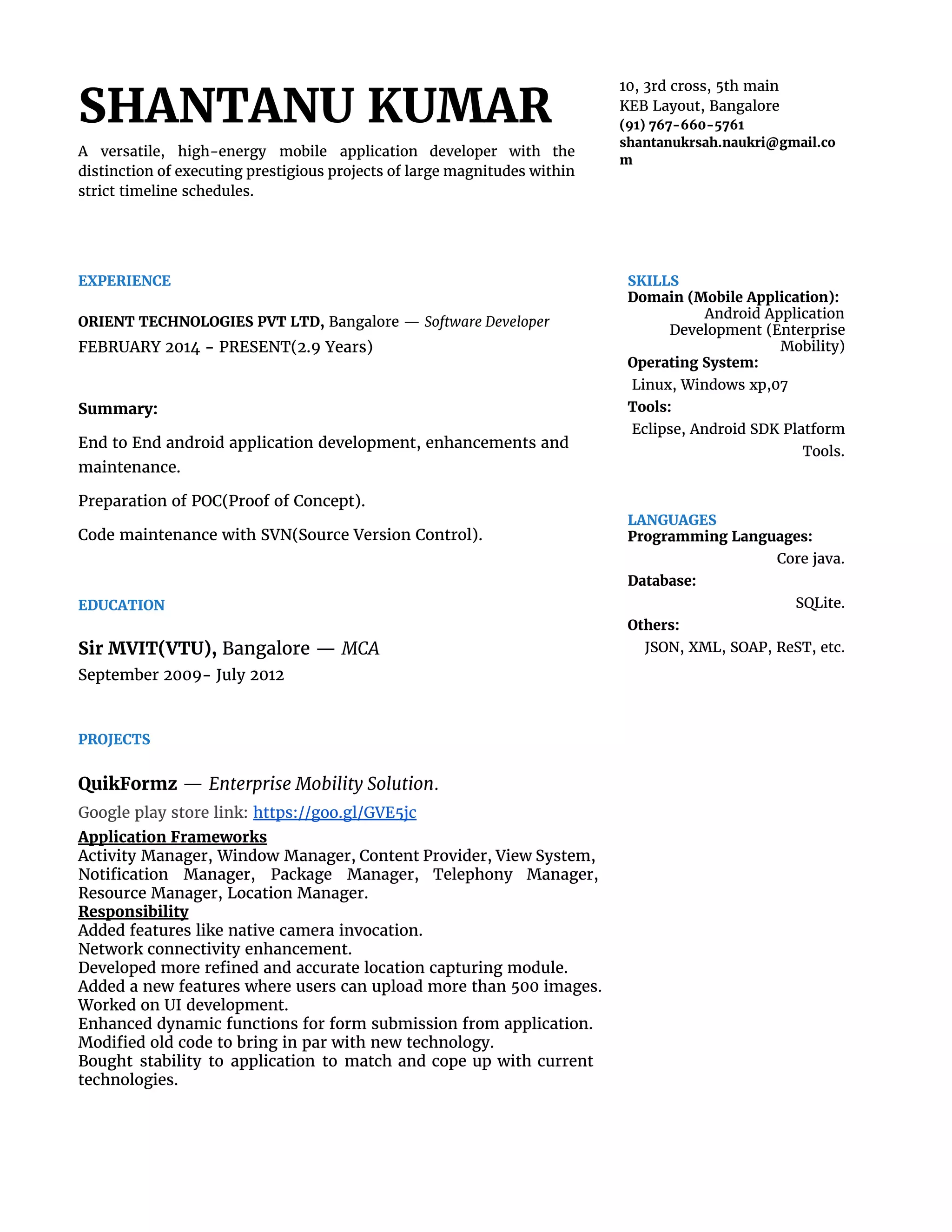 Shantanu Kumar is a mobile application developer with over 2.9 years of experience developing Android applications for enterprises. He has a MCA from Sir MVIT in Bangalore and has developed several enterprise mobility solutions for clients like Orient Technologies, Monsecure, Idea, Pest Control of India, Dun & Bradstreet, Indiacast and more. His skills include Android application development, Java, SQLite, JSON, XML and application frameworks like Activity Manager and Content Provider.