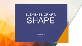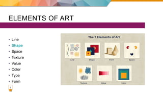 This document discusses the element of shape in art. It defines shape as a visually perceived area created by an enclosed line, color, or change in value. Shapes can be geometric, such as triangles and circles, or organic by abstracting aspects of real-life shapes. The document also discusses space as the area activated by other elements and how positive and negative space, or figure and ground, create a fundamental visual relationship in design. Balance is introduced as a principle of design relating to distributing visual weight in a composition to create a stable design through symmetrical, asymmetrical, or radial balance. Examples of each type of balance are shown across art, architecture and graphic design.
