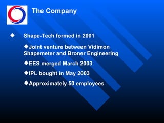 The document discusses opto-electronic measurement systems produced by Shape Technology Ltd for use in the steel and metal industries. It provides details on several of their key products: