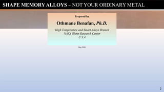 The document provides an in-depth overview of shape memory alloys (SMAs), detailing their historical background, material science, and applications, particularly in aeronautics and space. It explains how SMAs operate through various mechanisms and their advantages over conventional materials, such as reduced complexity and lightweight characteristics. Additionally, it covers practical considerations for mechanism design using SMAs and includes case studies to enhance understanding.