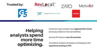 Shape is a PPC management platform that helps analysts regain time spent on manual workflows. Customers report gaining back 25% of time previously wasted. The platform provides customizable dashboards, budget management tools, alerts, and reporting to help teams efficiently manage accounts across multiple ad networks. Key features include auto-pausing of campaigns based on budgets, intelligent budget targets, syncing of accounts, and visualization of performance metrics. Testimonials praise Shape for preventing overspending through alerts and allowing more time for optimization tasks.