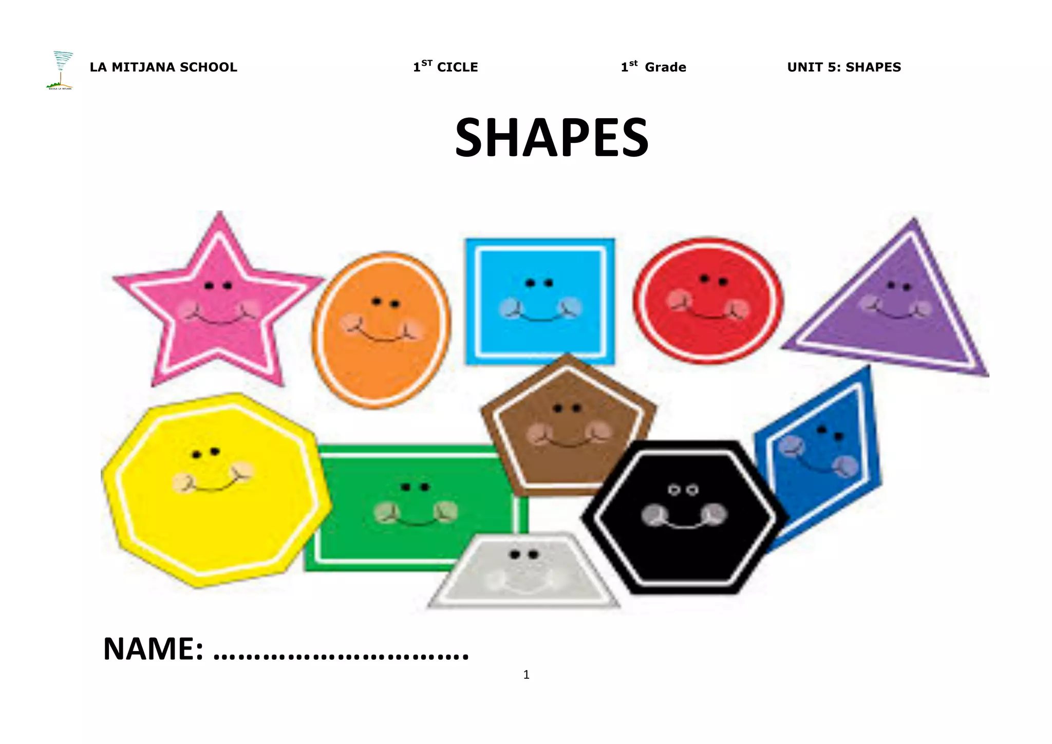 This document is from a 1st grade classroom unit on shapes. It contains several exercises for students to identify, count, and describe the location of different shapes like rectangles, circles, and triangles. The exercises encourage students to practice recognizing shapes, counting how many of each shape they see in an image, and filling in blanks to state where shapes are located in relation to different objects like tables, chairs, and sofas.