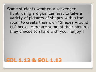 Students in Ms. Everts and Mrs. Goodman's class went on a scavenger hunt to find and photograph different shapes around their classroom. They took pictures of circles, triangles, squares, and rectangles to create their own book about shapes. The students then shared some of the pictures they took in their book called "Shapes Around Us."