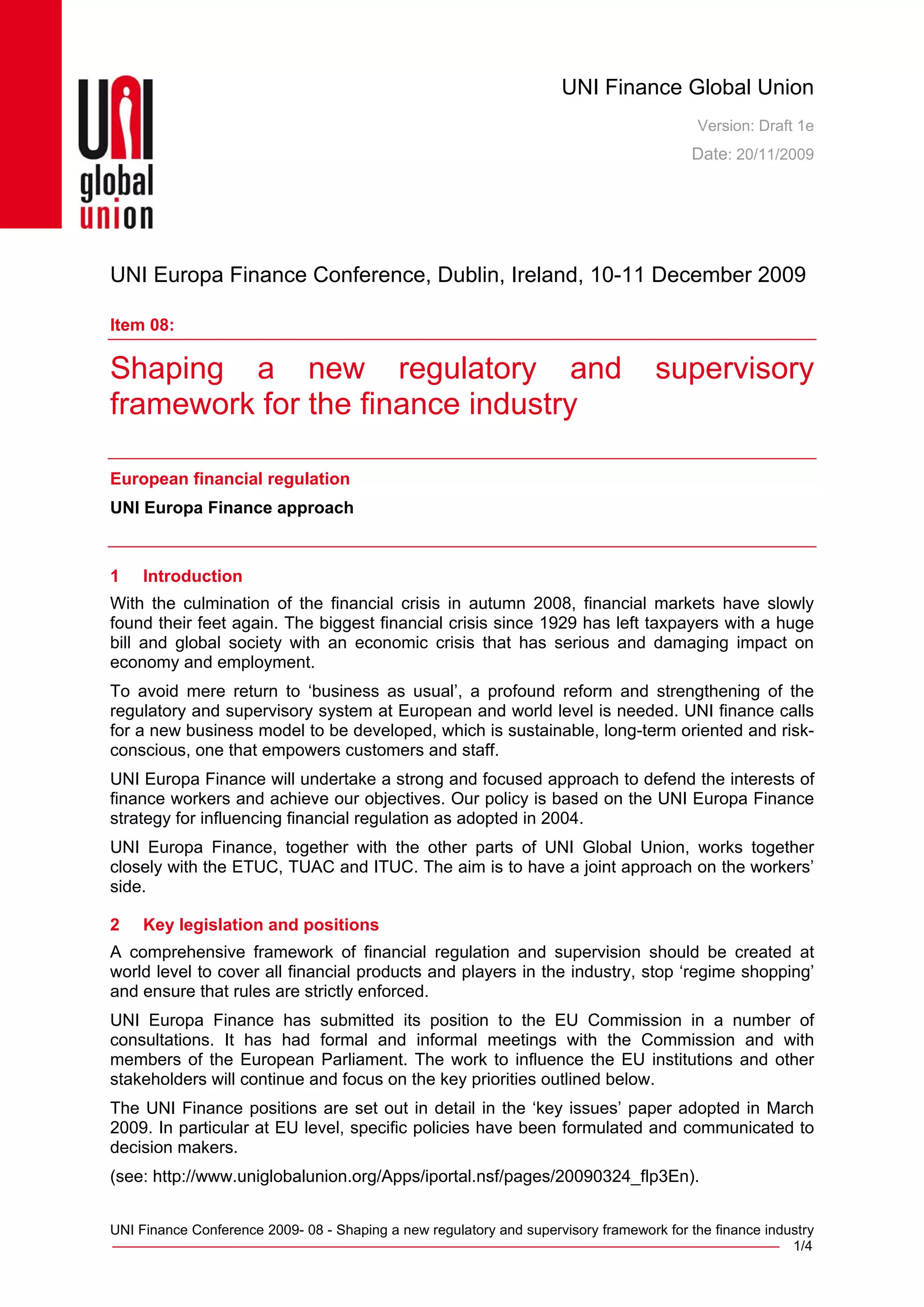 The document outlines UNI Europa Finance's approach to shaping a new regulatory and supervisory framework for the finance industry in Europe in response to the 2008 financial crisis. Key points include calling for a comprehensive regulatory framework at the EU and global levels, focusing lobbying efforts on six priority EU legislative initiatives regarding financial supervision and responsible sales practices, and coordinating with affiliated unions and organizations to jointly influence financial reform.