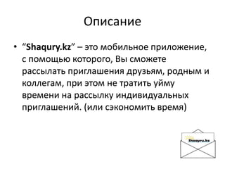 Приложение 'shaqyru.kz' позволяет быстро и экономично рассылать приглашения на мероприятия, избавляя пользователей от необходимости обзванивать и индивидуально приглашать гостей. Оно предлагает интеграцию контактов с телефона и автоматическую отправку приглашений через SMS и email. В настоящее время приложение находится на стадии разработки, и команда работы над ним включает специалистов по серверной и клиентской частям.