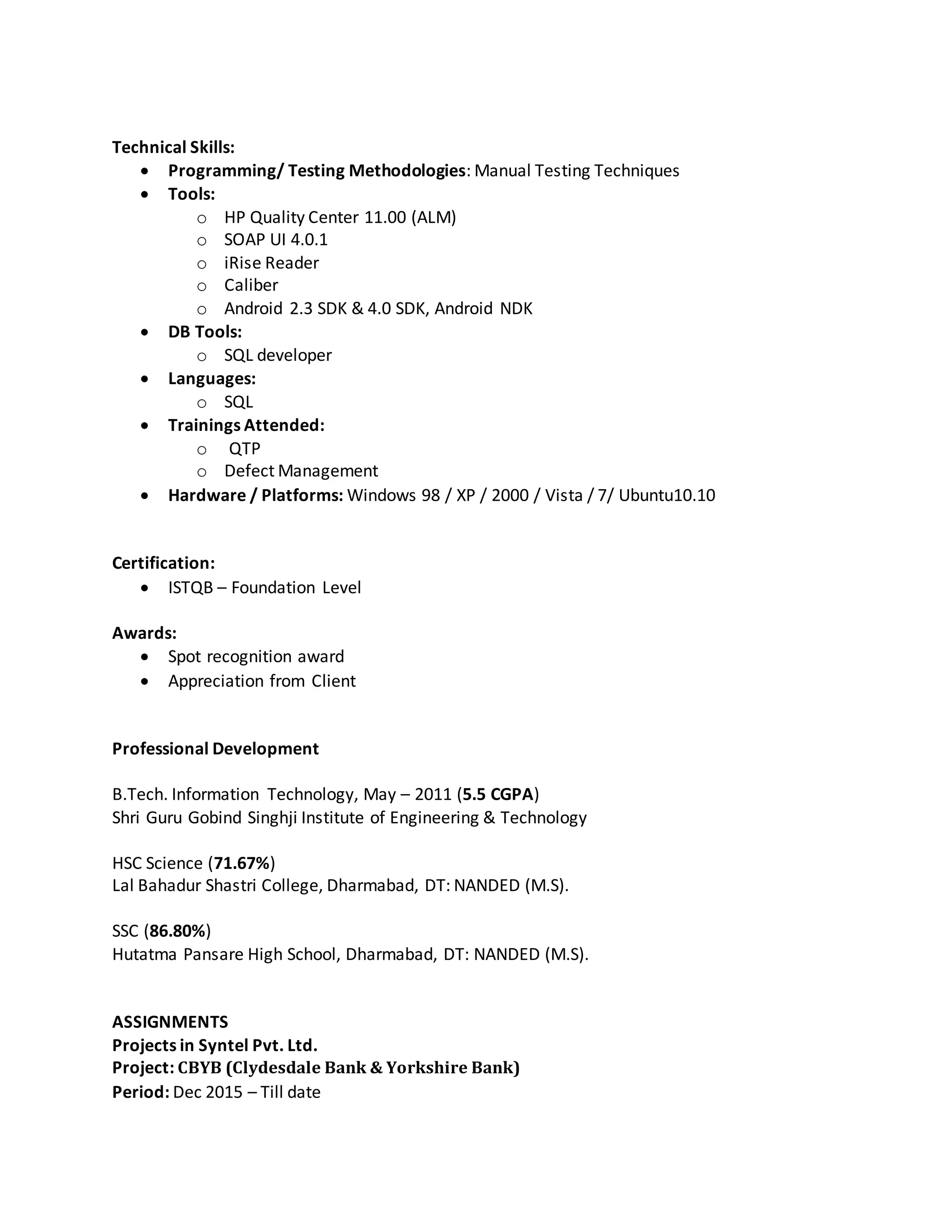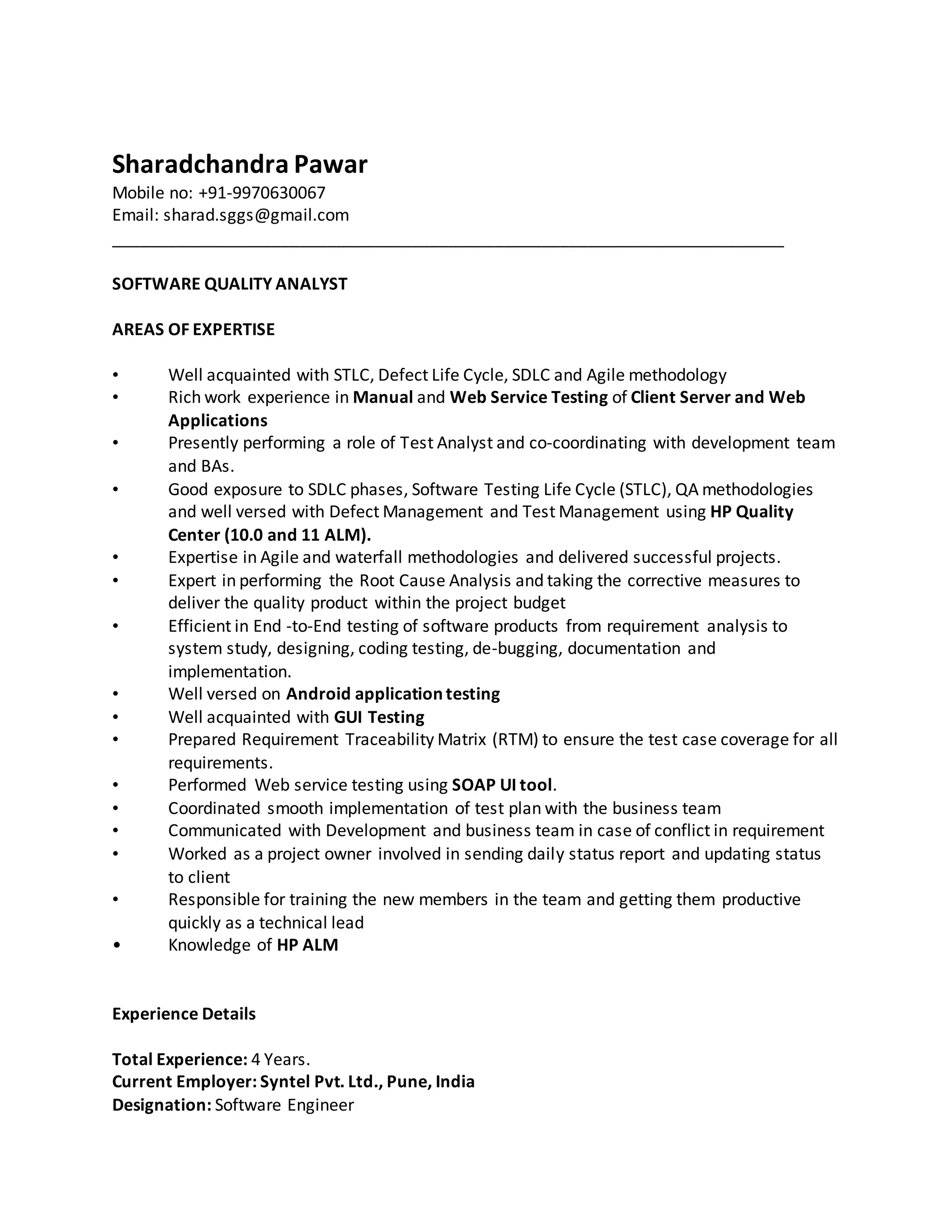 This document contains a summary of Sharadchandra Pawar's qualifications and experience as a Software Quality Analyst. He has over 4 years of experience in manual and web service testing using tools like HP Quality Center, SOAP UI, and SQL Developer. Some of his responsibilities include requirement analysis, test planning, defect management, reporting bugs, and coordinating with development teams. He has worked on projects in banking and logistics domains for clients like Clydesdale Bank, Yorkshire Bank, and FedEx.