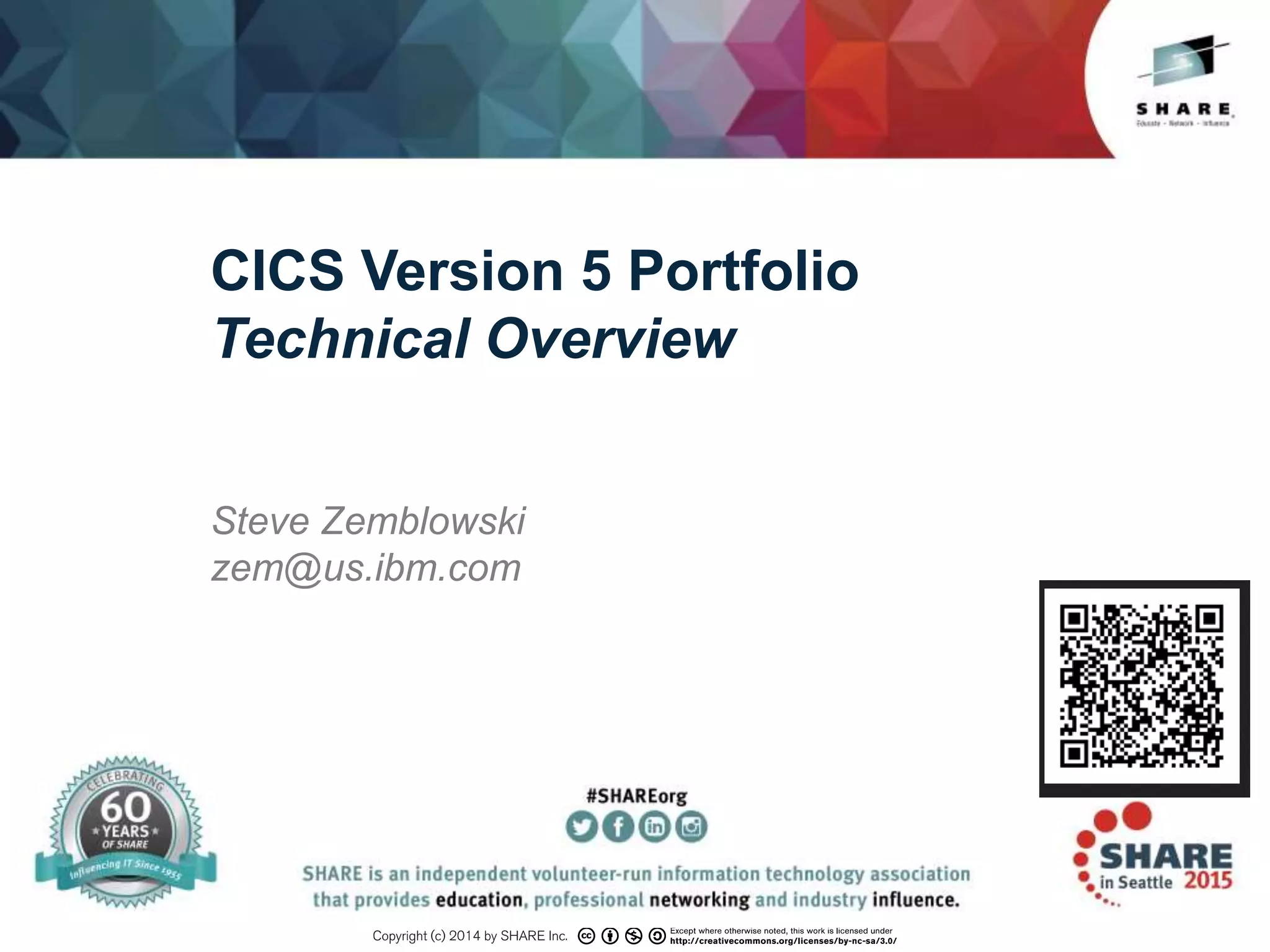 The document provides an overview of CICS Transaction Server V5.2, focusing on enhancements in the areas of service agility and operational efficiency. Key highlights include expanded support for JSON, mobile applications, and RESTful web services; policy-based management of system resources; TLS 1.2 compliance and SAML support for identity federation; and performance improvements through increased capacity limits and use of specialty processors.