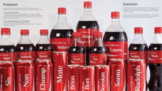 Coca-Cola launched a marketing campaign called "Share a Coke" in Australia to increase summer consumption and get people talking about the brand again. They printed the most popular names on Coke bottles to spark conversations and remind people of relationships. Young adult consumption increased 7% and the campaign improved perceptions of Coca-Cola among teens by personally connecting the brand to consumers through a shared naming experience.