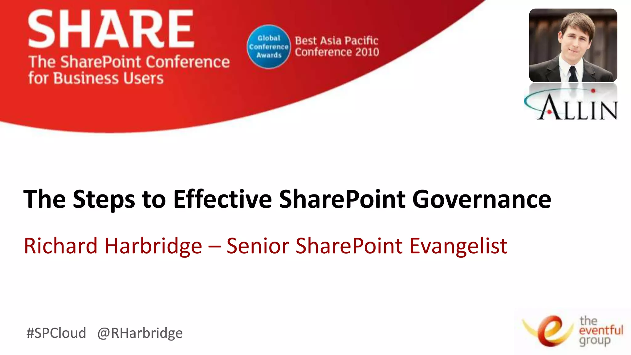 The document discusses the steps for effective SharePoint governance. It recommends establishing 5 governance teams - a business strategy team, solutions/technical strategy team, and 3 tactical teams. Each team has a defined role and responsibilities. Effective governance requires defining objectives, policies, standards and ongoing processes. Governance ensures organizations maximize the benefits of SharePoint while mitigating risks.