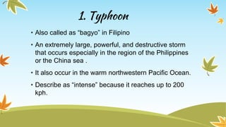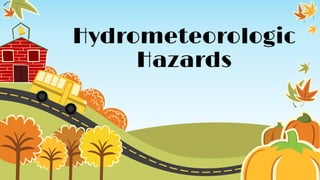 The document discusses various hydrometeorologic hazards that can occur in the Philippines and surrounding regions, including typhoons (called bagyos), which are large and powerful storms that can reach wind speeds up to 200 kph; thunderstorms, which produce thunder, lightning, heavy rain, and sometimes fires or air turbulence; floods, which occur when a large amount of water covers dry land from rising bodies of water; and flash floods, which are short local floods from heavy rainfall. It also mentions tornadoes and whirlwinds, storm surges, and classifies tropical cyclones from tropical depressions to super typhoons.