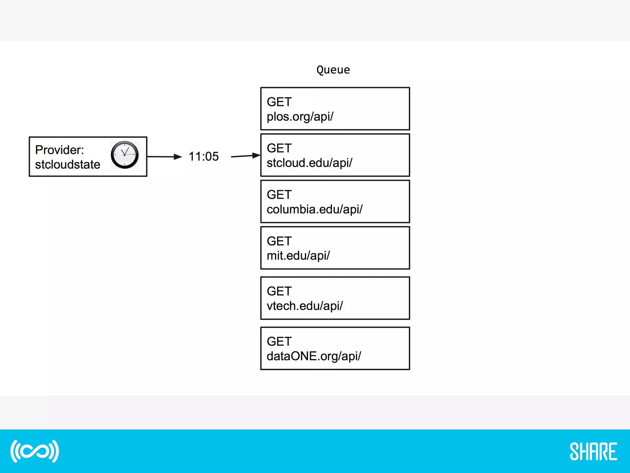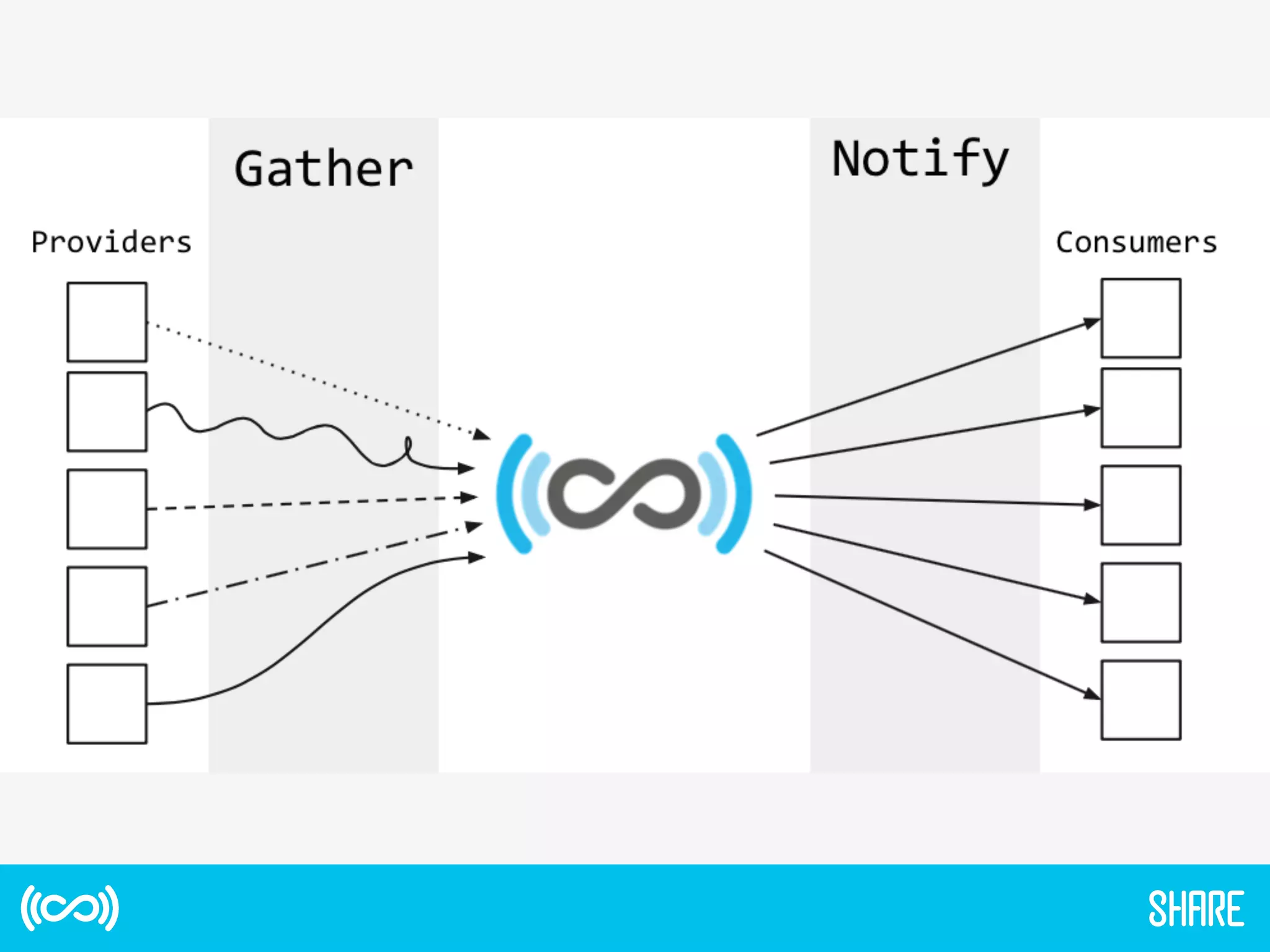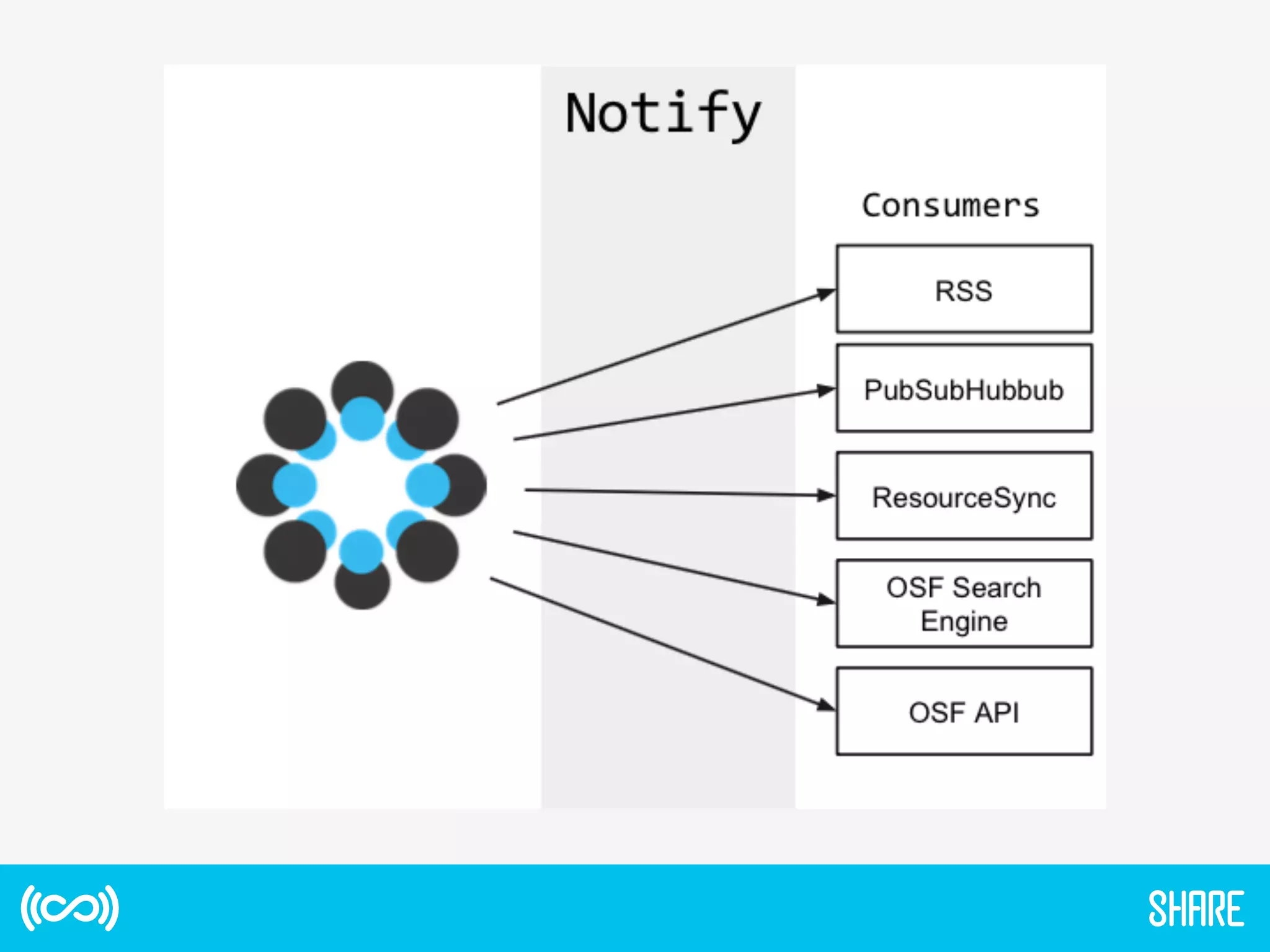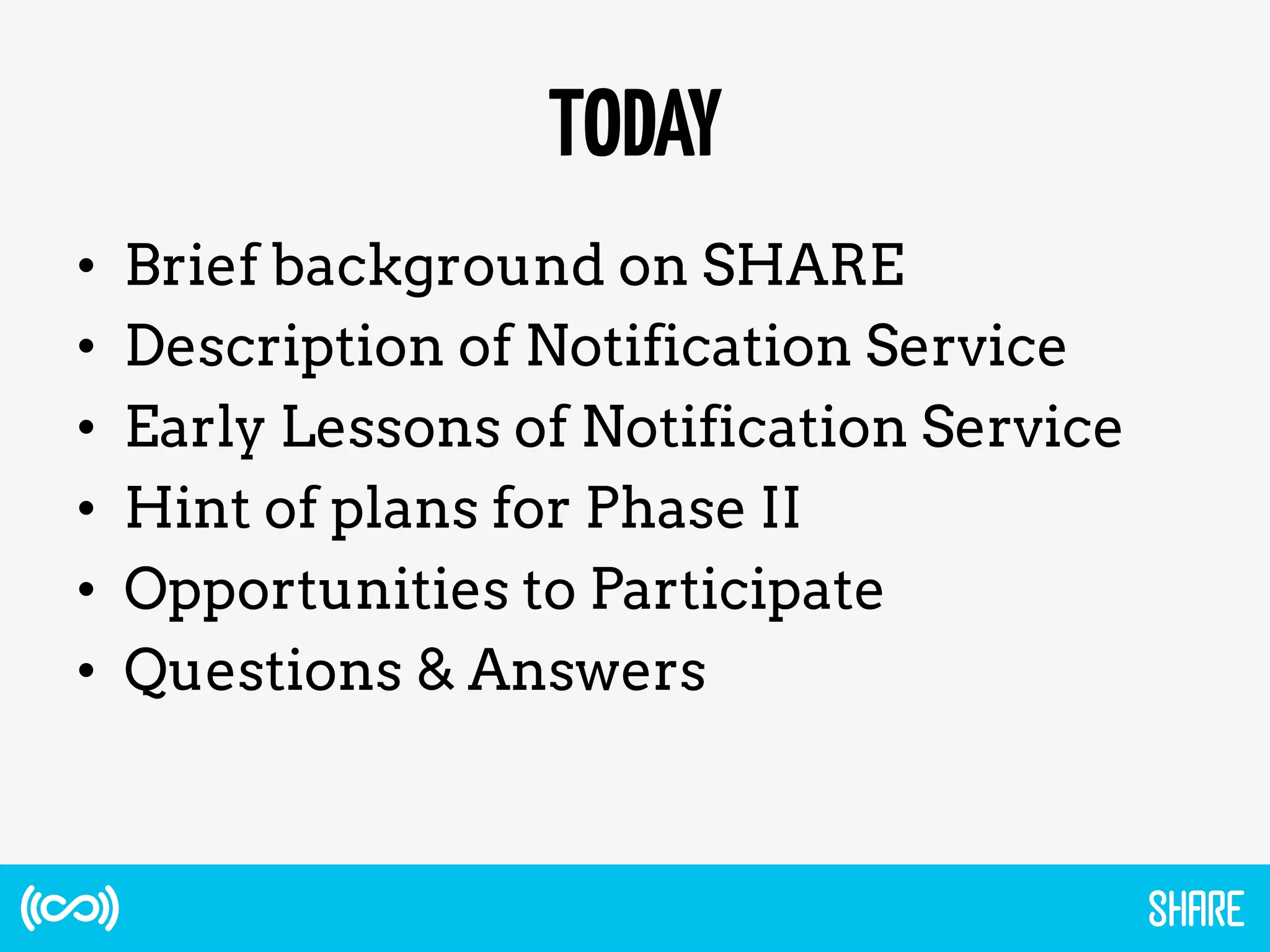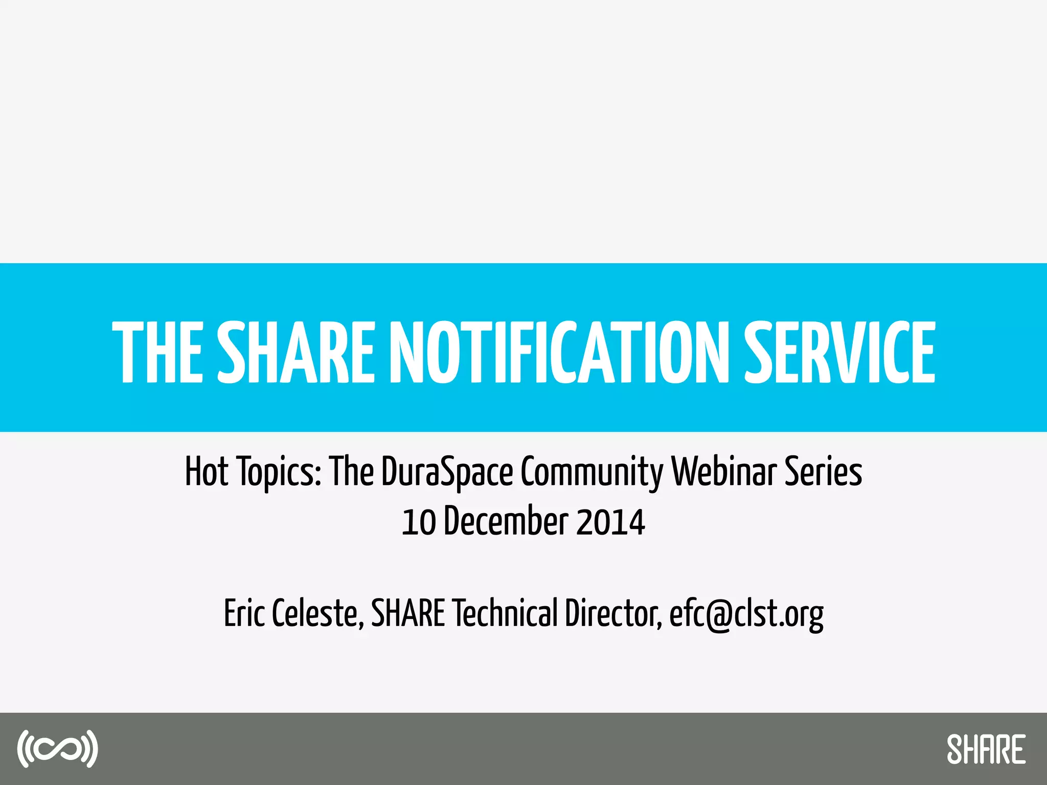 The document discusses the SHARE Notification Service, which aims to maximize research impact by keeping interested parties informed of research activities and outputs. It provides an overview of SHARE's mission and funding, describes the notification service which alerts subscribers about new research releases, and discusses early lessons learned. It also outlines plans for a Phase II that would provide a more comprehensive linked dataset to improve discovery and assessment of research impacts.