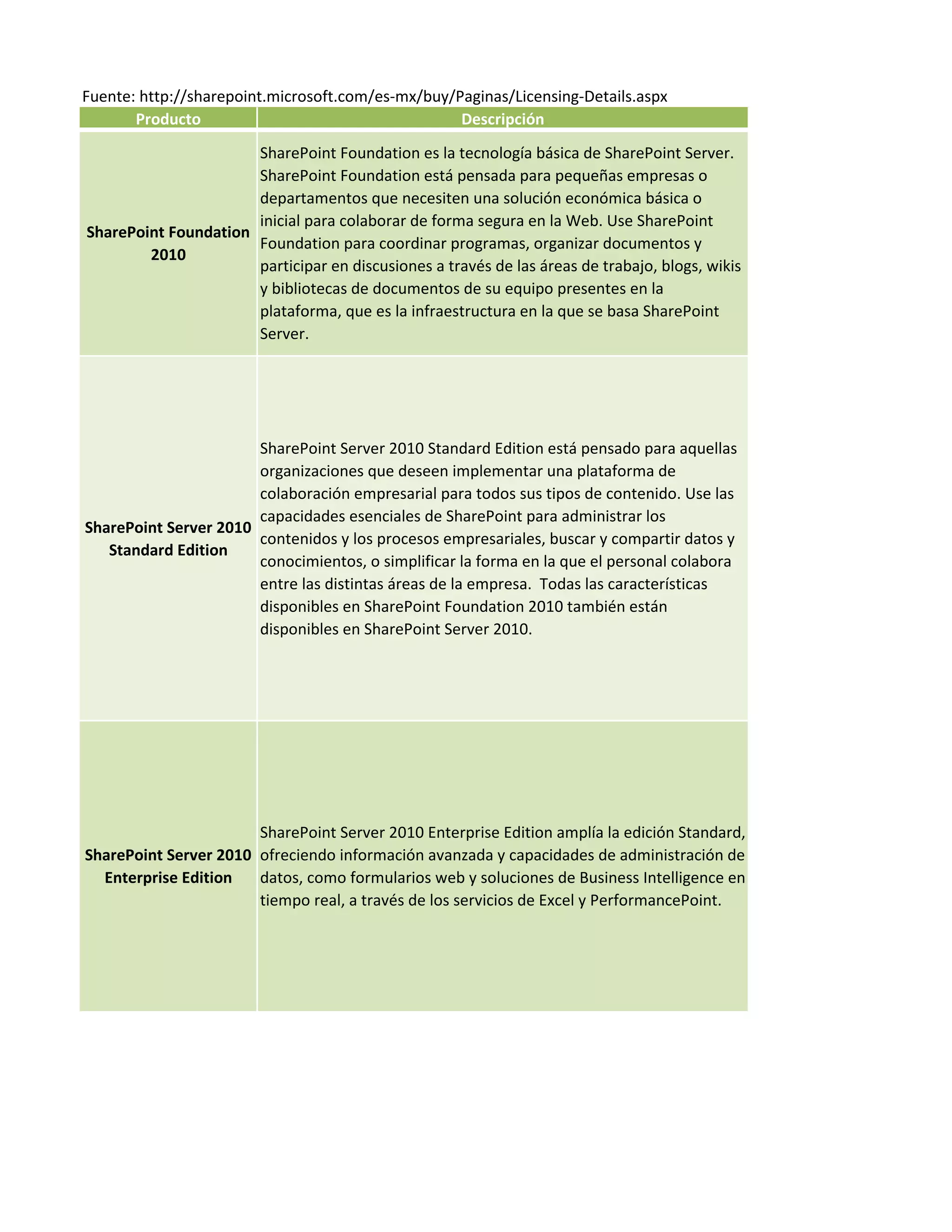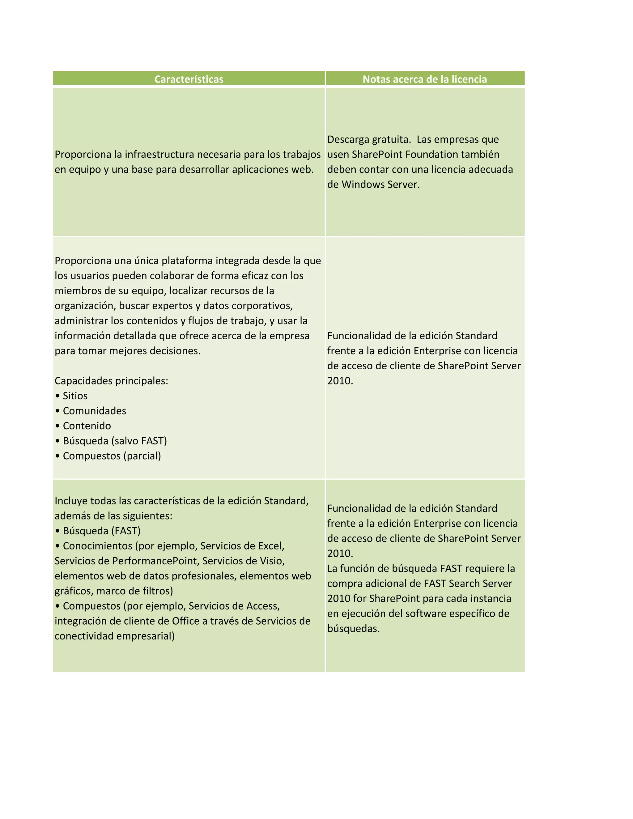 This document compares the features available in SharePoint Foundation, SharePoint Server 2010 Standard Edition, and SharePoint Server 2010 Enterprise Edition. It provides a table listing features across categories such as sites, communities, content, search, insights, and composites. For each feature, it indicates whether it is available in Foundation, Standard, or Enterprise editions. The document also includes notes about licensing for each product.