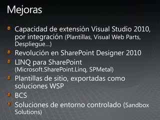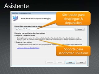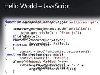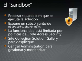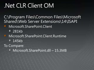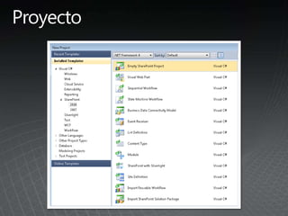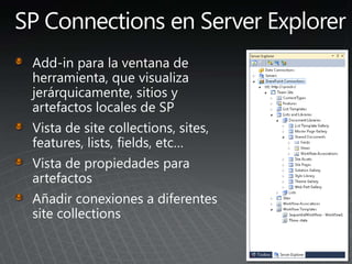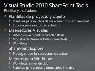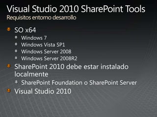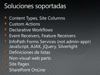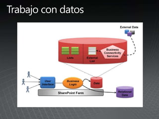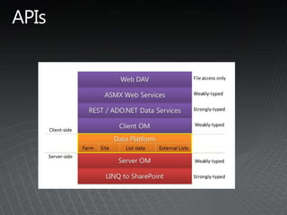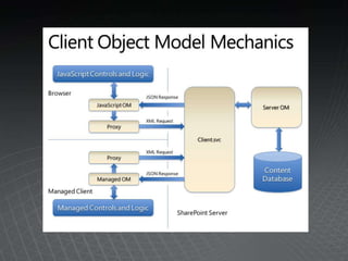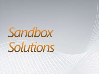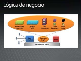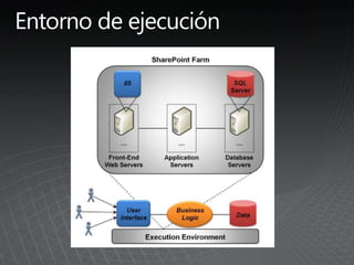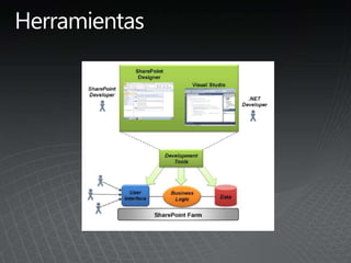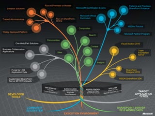 This document provides an overview of tools, technologies, and resources for developing business applications using the SharePoint platform. It outlines SharePoint server workloads, developer tools, the SharePoint ecosystem including community and partner resources, and the execution environment for building and deploying various types of SharePoint applications and solutions.