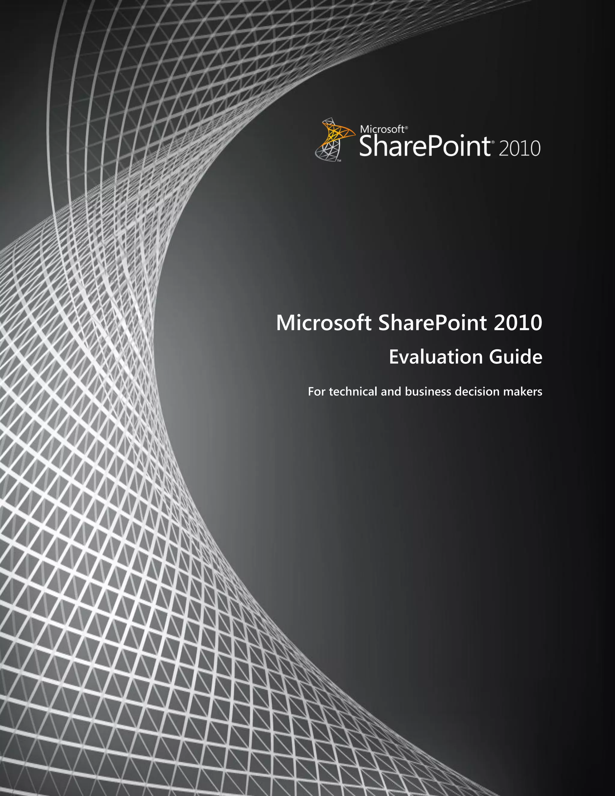 The Microsoft SharePoint 2010 Evaluation Guide outlines the platform's design goals, features, and implementation for technical and business decision-makers. It highlights key capabilities such as collaboration, social networking, search, and enterprise content management, providing a comprehensive overview to assist users in evaluating SharePoint 2010. The guide emphasizes enhanced user experiences and productivity improvements through a unified infrastructure and customizable features suitable for various business needs.