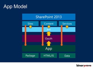 SharePoint 2013 provides an on-premise and cloud platform with improved performance, scalability, and social features. Key capabilities include simplified global navigation, deferred social and upgrade processes, distributed caching, and improved search performance through query rules and result-driven sources. Collaboration is enhanced through features like My Sites, communities, newsfeeds, following, tasks, and file sync. The platform also offers improved SEO, cross-site navigation, and device-specific experiences.