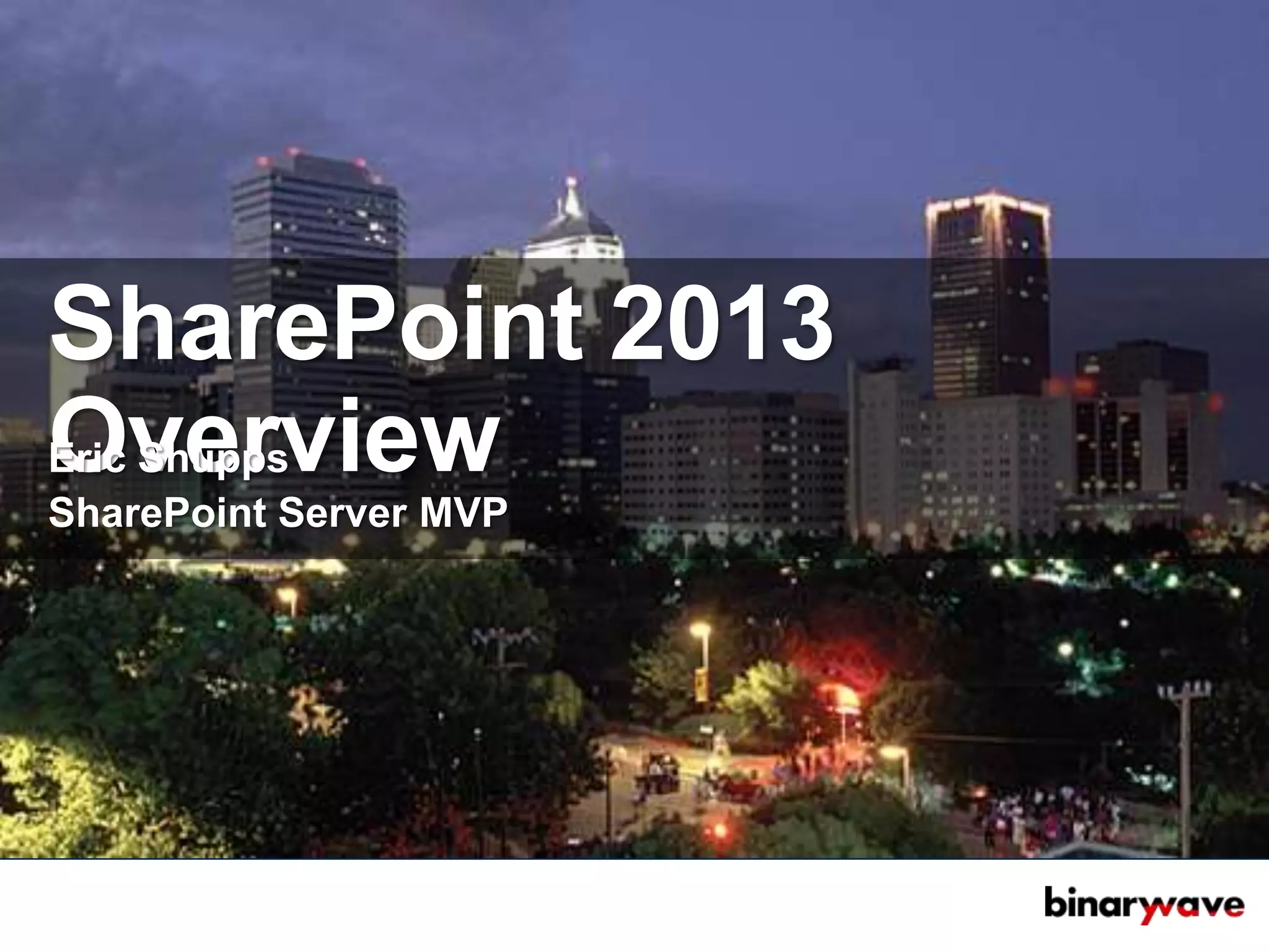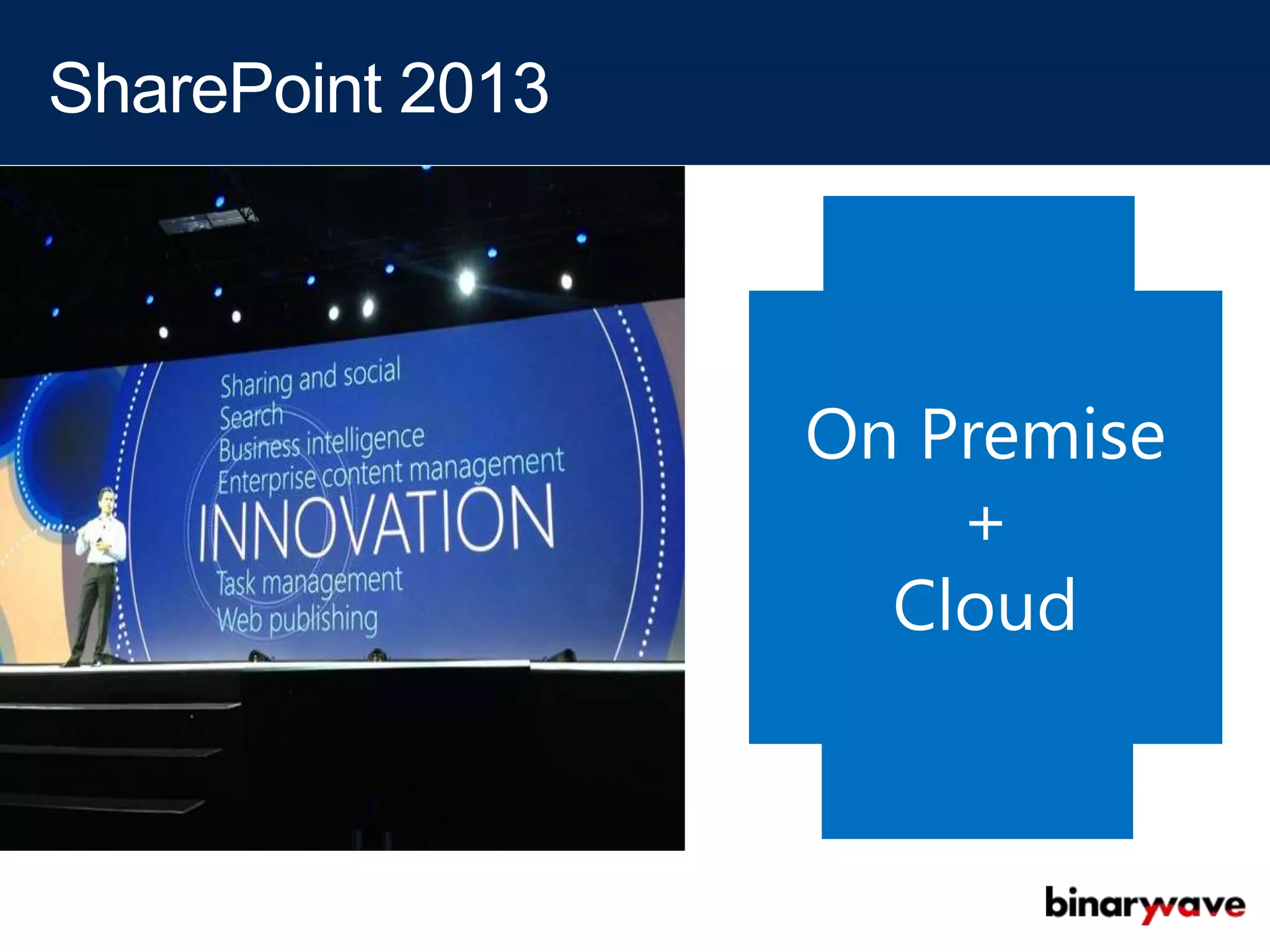 SharePoint 2013 provides an on-premise and cloud platform with improved performance, scalability, and social features. Key capabilities include simplified global navigation, deferred social and upgrade processes, distributed caching, and improved search performance through query rules and result-driven sources. Collaboration is enhanced through features like My Sites, communities, newsfeeds, following, tasks, and file sync. The platform also offers improved SEO, cross-site navigation, and device-specific experiences.