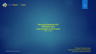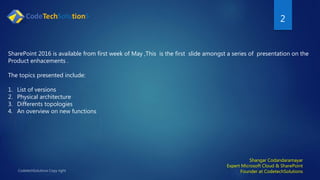 Shangar Codandaramayar of Codetech Solutions presents an overview of SharePoint 2016, detailing its on-premises and cloud versions, new physical architecture, and multi-device support. Key changes include the elimination of SharePoint Foundation and Designer, introduction of a 'minirole' topology, and enhanced integration with OneDrive and hybrid models. The presentation promises further insights into SharePoint 2016 functionalities and configurations.