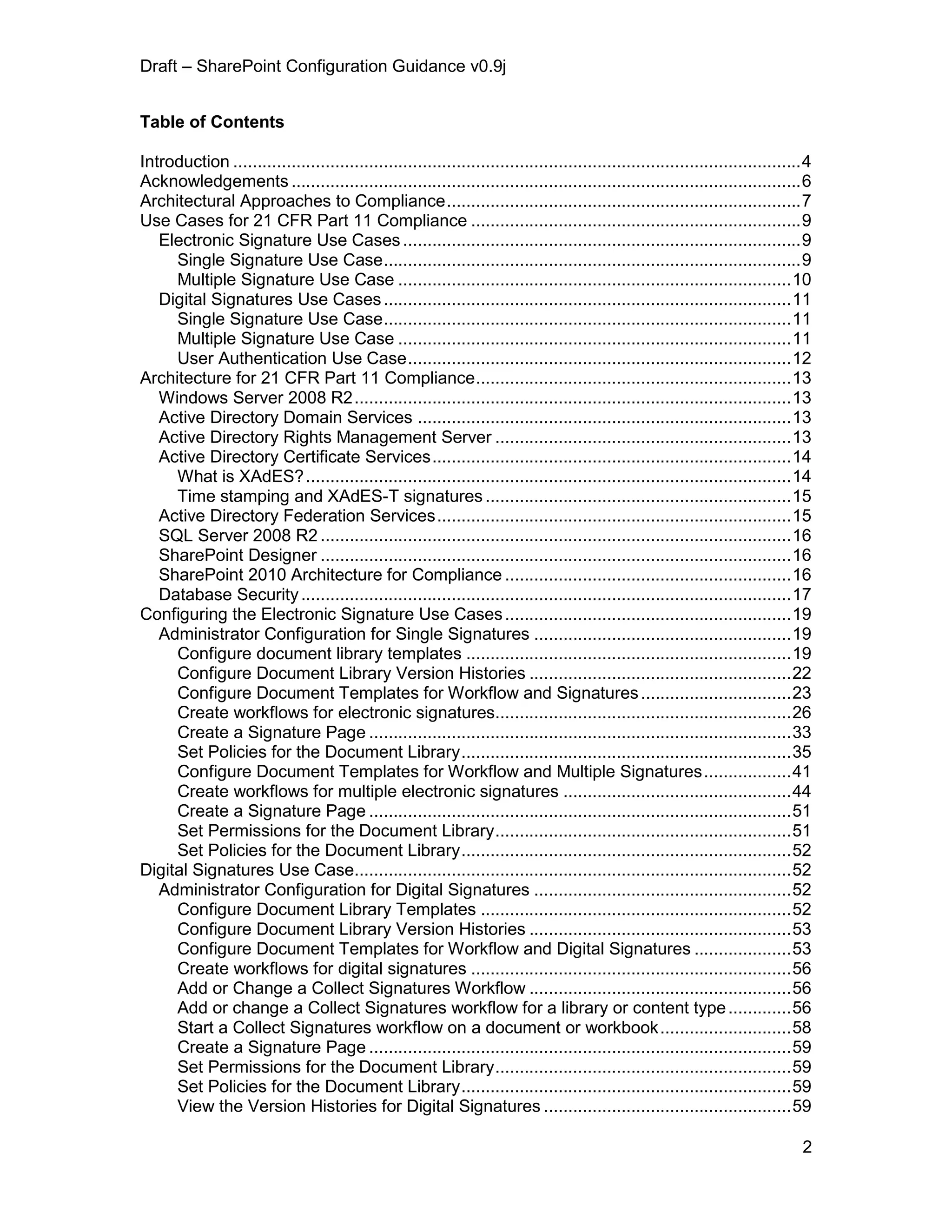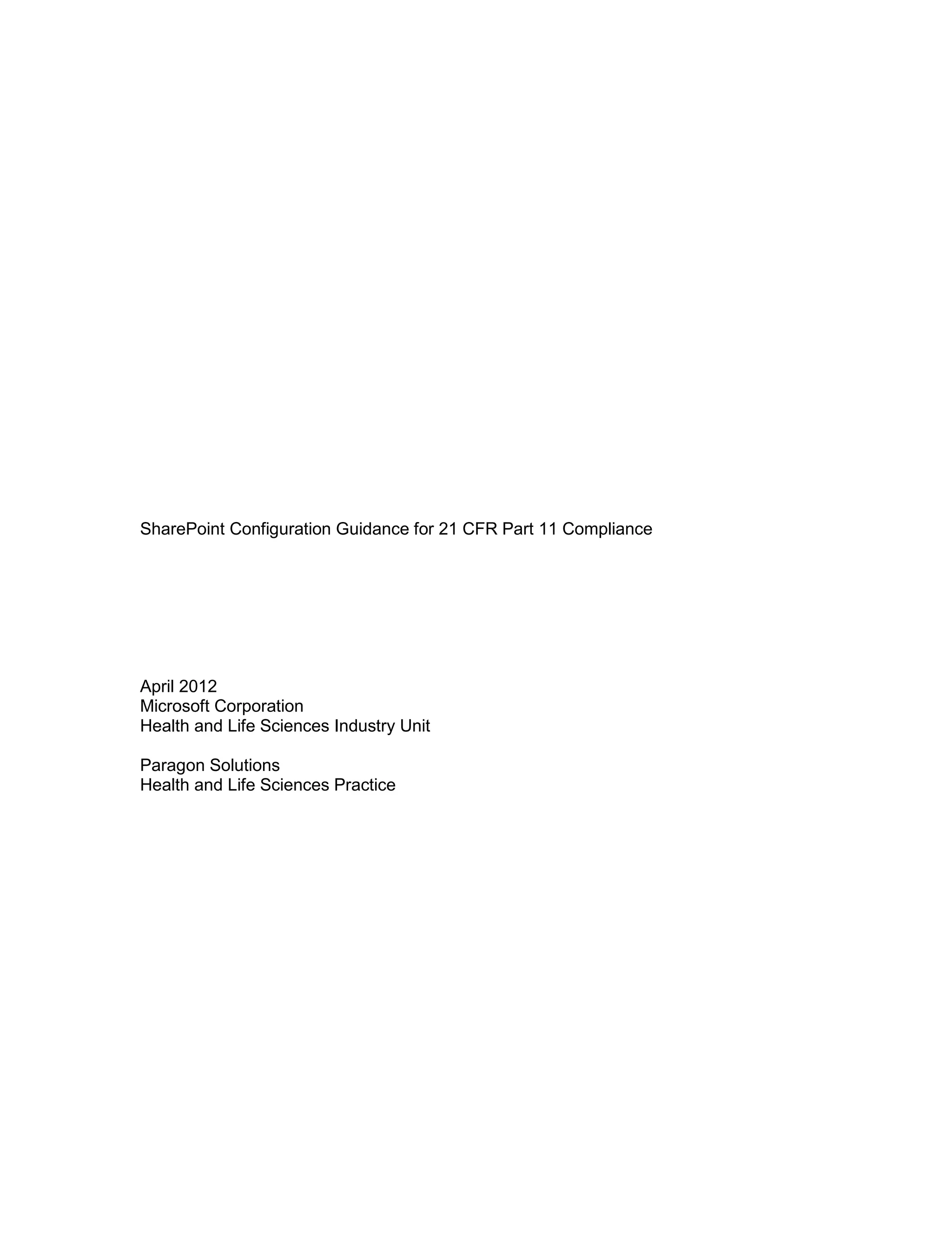 This document provides guidance on configuring Microsoft SharePoint for compliance with 21 CFR Part 11 regulations, focusing on electronic and digital signatures. It outlines architectural approaches, use cases, and necessary configurations to ensure valid electronic records and signatures within SharePoint 2010. The document aims to assist organizations in validating their systems while integrating features like audit trails and secure document management for regulatory adherence.