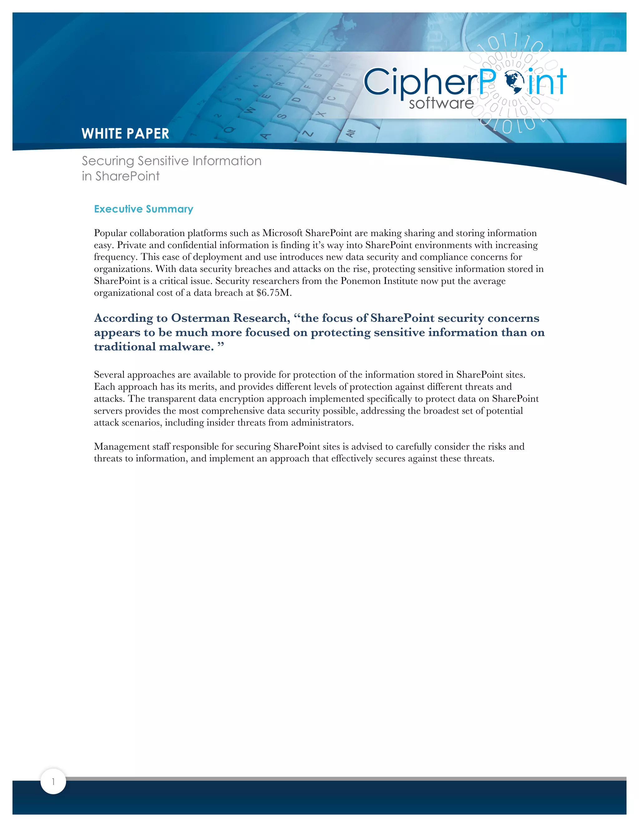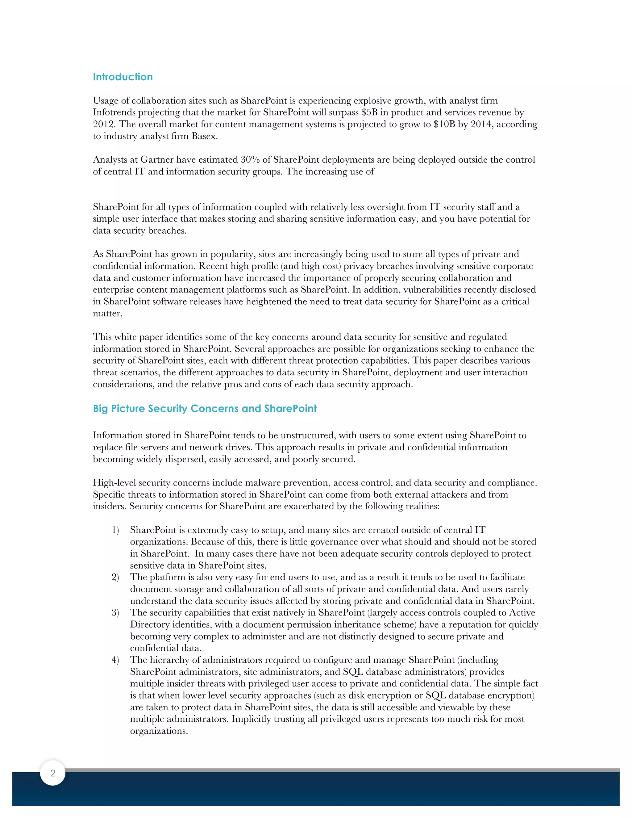 Popular collaboration platforms like SharePoint are increasingly used to store private information, raising data security concerns. While encryption at the disk or database levels provide some protection, they do not prevent access by privileged users like administrators. Transparent encryption at the application level protects against both external and insider threats by encrypting data and restricting access based on need-to-know. This provides the most comprehensive security for sensitive information stored in SharePoint.