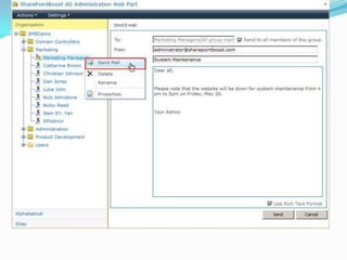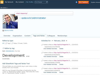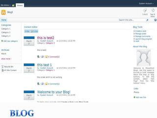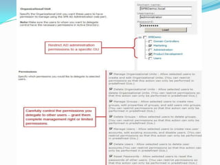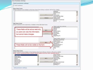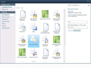 This document provides an overview of SharePoint 2010. It discusses that SharePoint is a platform rather than a program and describes its key features like sites, communities, content management, search capabilities, insights, composites, and security permissions including read, contribute, and full control. It also mentions SharePoint web parts, column/view permissions, Active Directory management, and the licensing options of SharePoint Foundation 2010, SharePoint Server 2010 Standard, and SharePoint Server 2010 Enterprise.