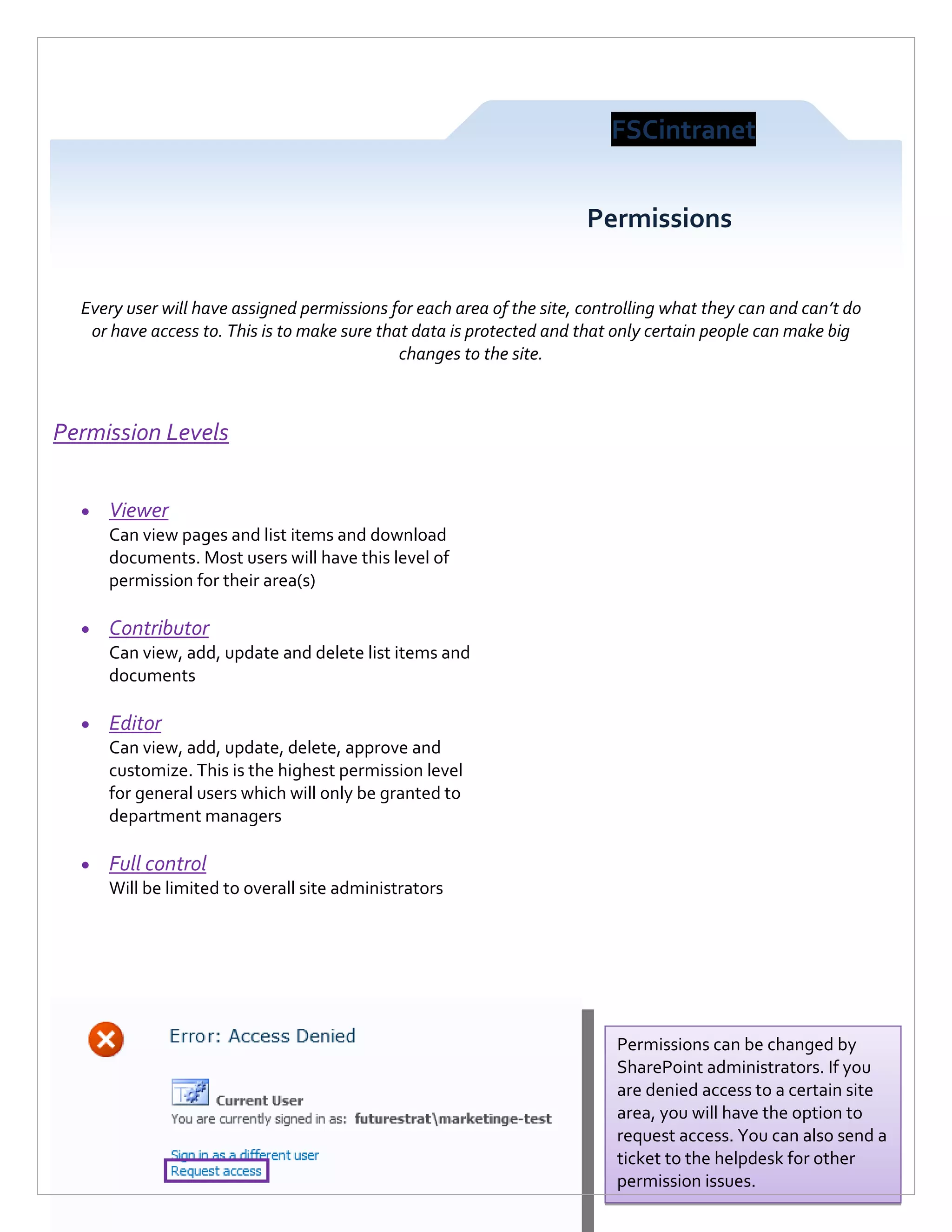 The document outlines the permission structure and functionalities of the FSC intranet SharePoint site, detailing different user roles such as viewer, contributor, editor, and full control administrator. It also explains how to navigate the site, utilize search functions, create and manage lists/libraries, and employ features like setting alerts and customizing content types. Overall, it serves as a comprehensive guide for users on accessing and managing content within the SharePoint platform.