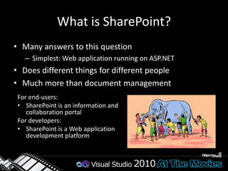 - SharePoint can be used for document management, collaboration, and as a development platform.