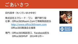 ごあいさつ 目代昌幸(もくだいまさゆき) 株式会社エクシード・ワン 鍵戸締り役 仕事:Office365Room.Comで情報発信担当 http://www.office365room.com Office365勉強会主催者 専門:Office365相談窓口、Facebook担当 Office365MVP 2014年1月~