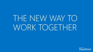 This document introduces new features for collaborating and managing team communications using SharePoint 2013. Key highlights include organizing all team communications in a single place, managing permissions to control access, writing apps that can run on multiple platforms, running SharePoint in the cloud for faster updates and improved performance, and controlling how sites are provisioned for more automated processes. It also provides links to download an evaluation version, learn more about SharePoint, and attend an upcoming SharePoint conference.