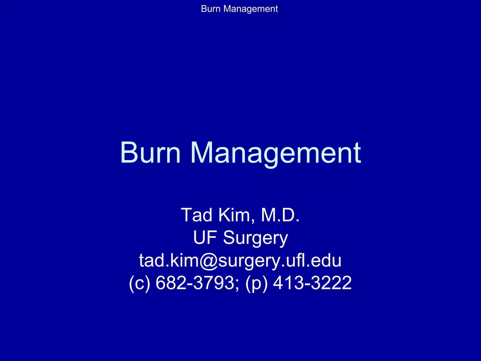 This document provides an overview of burn management, including the pathophysiology of burns, classification of burn depth, criteria for transfer to a burn center, initial assessment and management, airway management, shock and fluid resuscitation, burn wound management including for electrical and chemical burns. It details the Parkland formula for fluid resuscitation and management of potential airway compromise, circumferential limb burns requiring escharotomy, wound infection prevention and timing of excision and grafting.