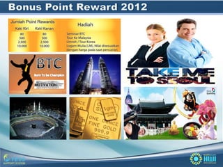 Dokumen ini menguraikan tentang peluang bisnis melalui sistem pemasaran jaringan di PT. Health Wealth International (HWI) yang menawarkan produk berkualitas tinggi dan rencana pemasaran yang mudah dijangkau. HWI berkomitmen untuk membantu mitra usahanya mencapai kesuksesan melalui pelatihan dan pembinaan, serta menyediakan berbagai peluang penghasilan dari bisnis online dan offline. Dengan investasi awal yang rendah, HWI menawarkan kesempatan untuk membangun karier yang berkelanjutan dan memberikan dukungan bagi pengembangan kesehatan dan kesejahteraan.