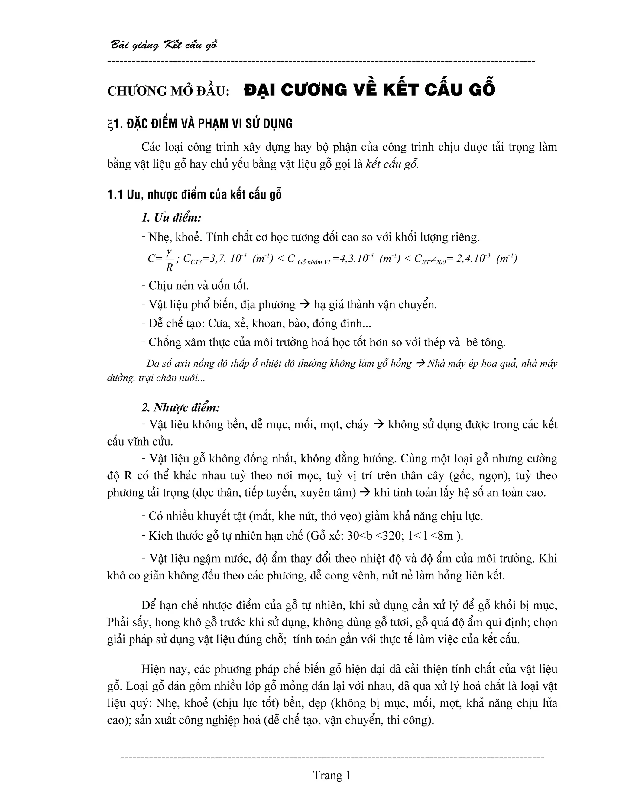 cáúu gäù -------------------------------------------------------------------------------------------------------- ------------------------------------------------------------------------------------------------------- Trang 1 CHÆÅNG MÅÍ ÂÁÖU: ÂAÛI CÆÅNG VÃÖ KÃÚT CÁÚU GÄÙ ξ1. ÂÀÛC ÂIÃØM VAÌ PHAÛM VI SÆÍ DUÛNG Caïc loaûi cäng trçnh xáy dæûng hay bäü pháûn cuía cäng trçnh chëu âæåüc taíi troüng laìm bàòng váût liãûu gäù hay chuí yãúu bàòng váût liãûu gäù goüi laì kãút cáúu gäù. 1.1 Æu, nhæåüc âiãøm cuía kãút cáúu gäù 1. Æu âiãøm: - Nheû, khoeí. Tênh cháút cå hoüc tæång âäúi cao so våïi khäúi læåüng riãng. C= R γ ; CCT3=3,7. 10-4 (m-1 ) < C Gäù nhoïm VI =4,3.10-4 (m-1 ) < CBT≠200= 2,4.10-3 (m-1 ) - Chëu neïn vaì uäún täút. - Váût liãûu phäø biãún, âëa phæång haû giaï thaình váûn chuyãøn. - Dãù chãú taûo: Cæa, xeí, khoan, baìo, âoïng âinh... - Chäúng xám thæûc cuía mäi træåìng hoaï hoüc täút hån so våïi theïp vaì bã täng. Âa säú axit näöng âäü tháúp åí nhiãût âäü thæåìng khäng laìm gäù hoíng Nhaì maïy eïp hoa quaí, nhaì maïy âæåìng, traûi chàn nuäi... 2. Nhæåüc âiãøm: - Váût liãûu khäng bãön, dãù muûc, mäúi, moüt, chaïy khäng sæí duûng âæåüc trong caïc kãút cáúu vénh cæíu. - Váût liãûu gäù khäng âäöng nháút, khäng âàóng hæåïng. Cuìng mäüt loaûi gäù nhæng cæåìng âäü R coï thãø khaïc nhau tuyì theo nåi moüc, tuyì vë trê trãn thán cáy (gäúc, ngoün), tuyì theo phæång taíi troüng (doüc thán, tiãúp tuyãún, xuyãn tám) khi tênh toaïn láúy hãû säú an toaìn cao. - Coï nhiãöu khuyãút táût (màõt, khe næït, thåï veûo) giaím khaí nàng chëu læûc. - Kêch thæåïc gäù tæû nhiãn haûn chãú (Gäù xeí: 30<b <320; 1< l <8m ). - Váût liãûu ngáûm næåïc, âäü áøm thay âäøi theo nhiãût âäü vaì âäü áøm cuía mäi træåìng. Khi khä co giaîn khäng âãöu theo caïc phæång, dãù cong vãnh, næït neí laìm hoíng liãn kãút. Âãø haûn chãú nhæåüc âiãøm cuía gäù tæû nhiãn, khi sæí duûng cáön xæí lyï âãø gäù khoíi bë muûc, Phaíi sáúy, hong khä gäù træåïc khi sæí duûng, khäng duìng gäù tæåi, gäù quaï âäü áøm qui âënh; choün giaíi phaïp sæí duûng váût liãûu âuïng chäù; tênh toaïn gáön våïi thæûc tãú laìm viãûc cuía kãút cáúu. Hiãûn nay, caïc phæång phaïp chãú biãún gäù hiãûn âaûi âaî caíi thiãûn tênh cháút cuía váût liãûu gäù. Loaûi gäù daïn gäöm nhiãöu låïp gäù moíng daïn laûi våïi nhau, âaî qua xæí lyï hoaï cháút laì loaûi váût liãûu quyï: Nheû, khoeí (chëu læûc täút) bãön, âeûp (khäng bë muûc, mäúi, moüt, khaí nàng chëu læía cao); saín xuáút cäng nghiãûp hoaï (dãù chãú taûo, váûn chuyãøn, thi cäng).
