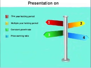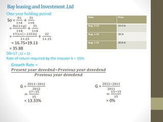 This document contains calculations for the net present value of holding periods for multiple companies. For each company, it calculates a one-year holding period value and a multiple year holding period value using constant dividend growth models. It also includes calculations for growth rates, earnings per share, and price-earnings ratios for each company. The document contains these calculations for six different companies over multiple dates and years.