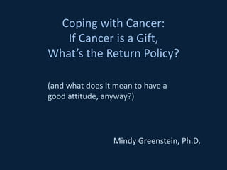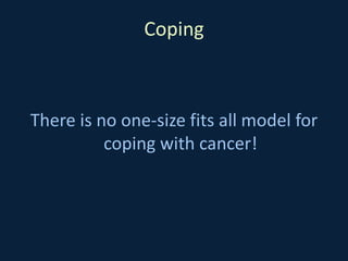 The document discusses various coping strategies and perspectives on dealing with cancer, emphasizing that there is no universal approach; it highlights practicality and individual preferences. It explores the positive outcomes of cancer experiences, such as greater appreciation for relationships and personal growth, while also underlining the importance of mindfulness and finding meaning in life. Additionally, it includes recommended resources and media that can provide support and comfort during such challenging times.