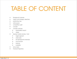 This document outlines a business plan for Sharebox, a collaborative consumption platform that uses a smart locker system to allow community members to lend, borrow, or trade items. It discusses the problem of urban sprawl and overconsumption of physical space. The business model canvas describes the platform's key activities, resources, customer segments, channels, and revenue streams. Interviews provide positive feedback from potential customers. The rollout plan and financial projections are not included in detail.