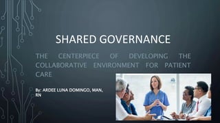 This document discusses shared governance in healthcare. Shared governance is a management model that empowers all members of a healthcare organization to have a voice in decision-making through shared leadership and participative decision making. It traces the evolution of shared governance from concepts in ancient Greek philosophy to its adoption in healthcare in the late 1970s. The principles and benefits of shared governance for nurses include increased job satisfaction, nurse retention, and improved patient outcomes. Barriers to implementing shared governance include perceived loss of power by managers and difficulty finding time for staff participation. Successful shared governance requires leadership support, structural changes, and reinforcing new processes of interaction.