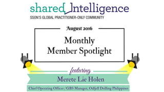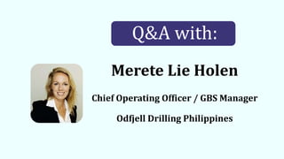 Merete Lie Holen, COO and GBS Manager of Odfjell Drilling Philippines, has a background in shared services that began in 2015. She oversees a captive shared services center and aims to expand the scope of work while ensuring quality deliverables. Holen emphasizes the importance of communication and engagement among her team to achieve continuous improvement and competitive advantage in the oil & gas market.