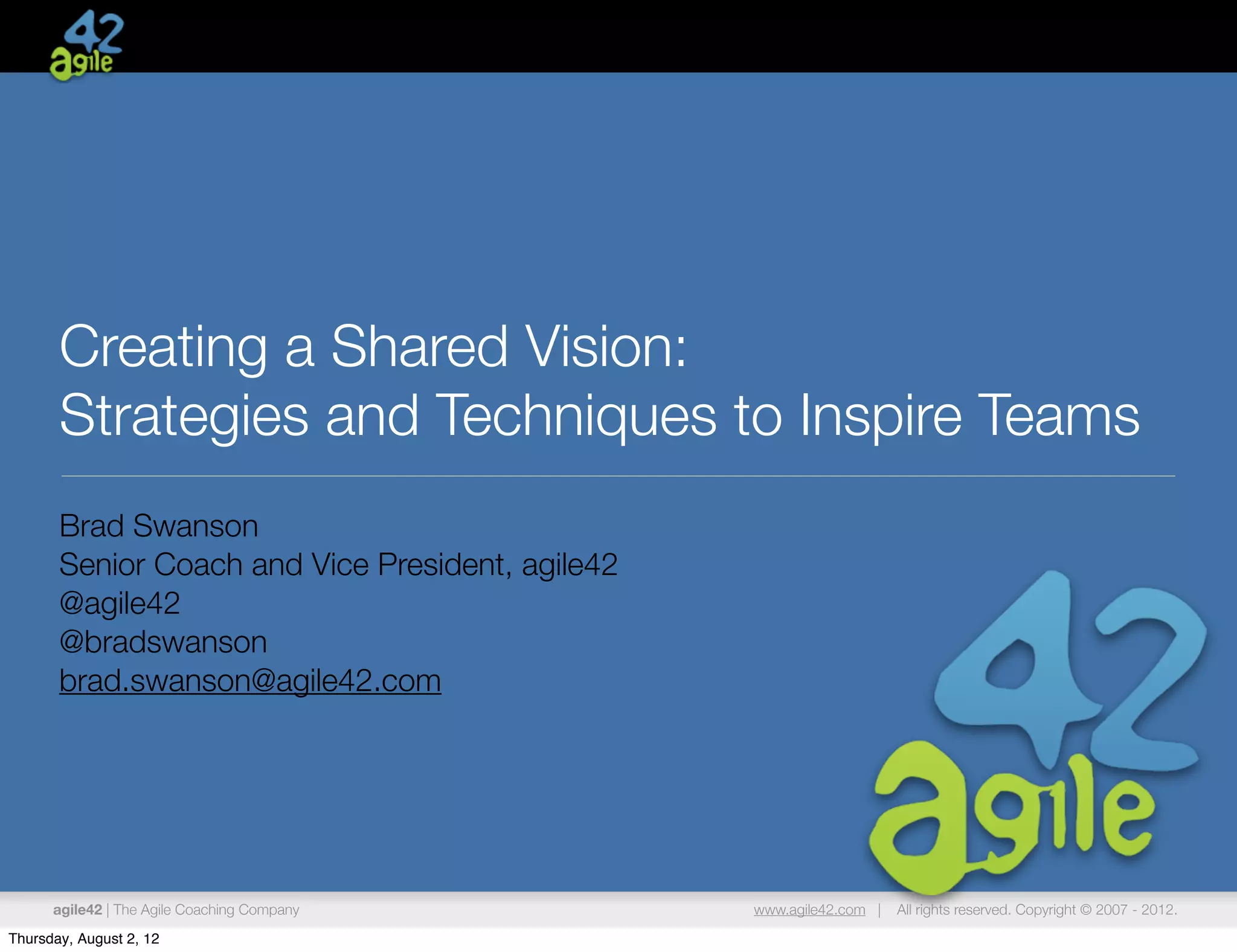 The document discusses strategies for creating a shared vision among teams. It describes five common strategies: telling, selling, testing, consulting, and co-creating. Telling involves dictating the vision from leadership while co-creating involves developing the vision collaboratively. The document provides examples of how different strategies were used successfully, such as Kennedy's vision for NASA. It also outlines activities and tools that teams can use to develop a shared vision, including exploring the strategies, co-creating a vision for an agile conference, and using the Passion Meter protocol to identify high priority elements.