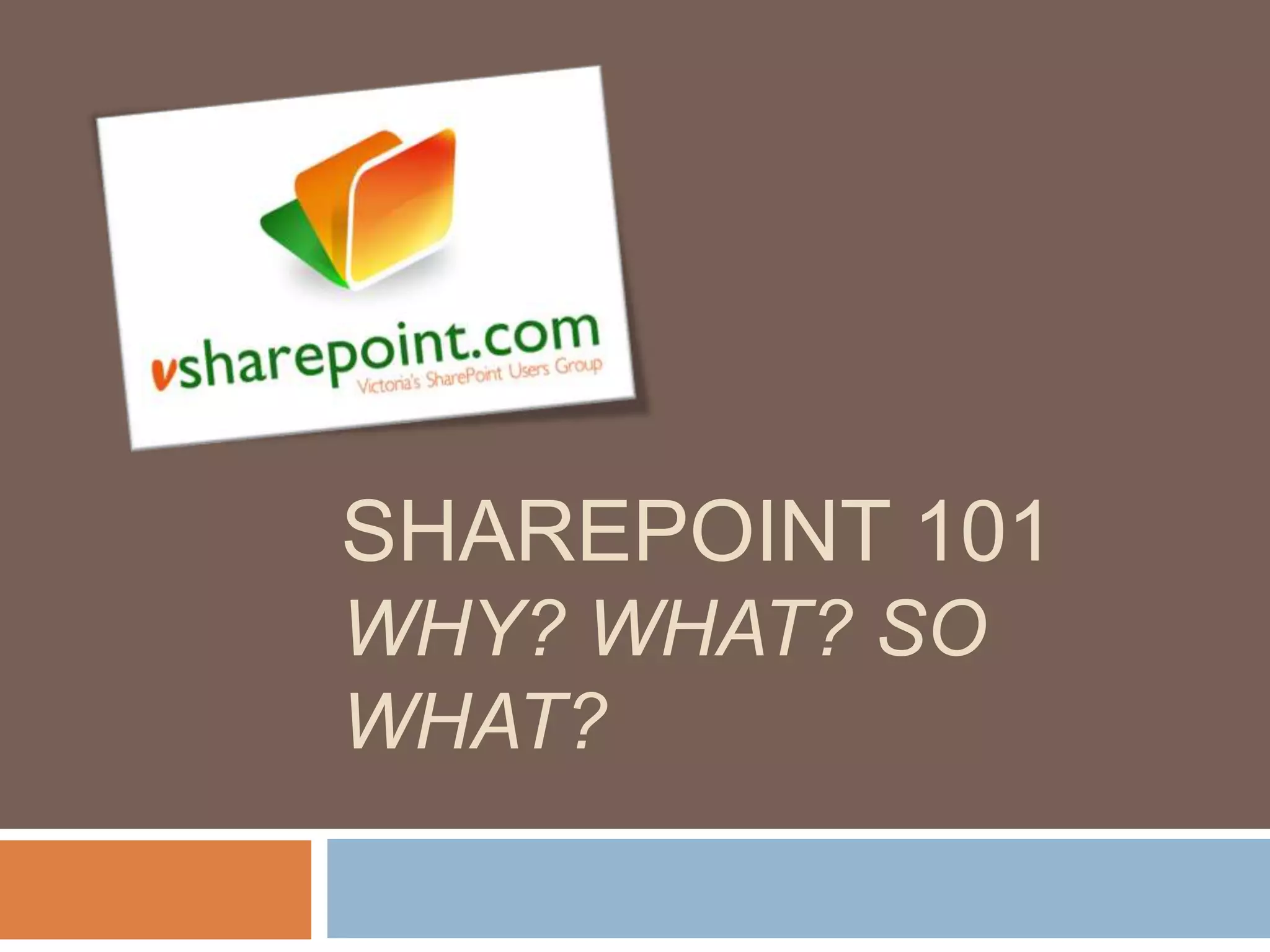 SharePoint 101 provides an overview of SharePoint, including why organizations use it, its key features, and how those features can help teams. Some of the main points covered include: