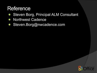 The document outlines a presentation agenda by Ivan Sanders, a SharePoint architect, focusing on reporting in TFS 2010. It includes topics like existing reports, the TFS data warehouse, ad-hoc reporting with Excel services, and modifying SSRS reports. The document also lists trusted blogs and additional resources for further information on the topic.