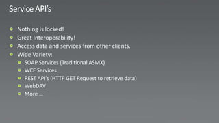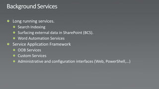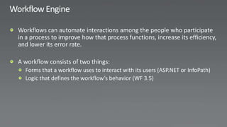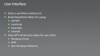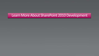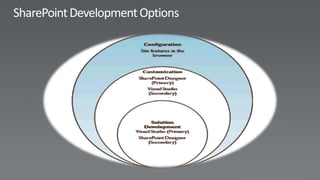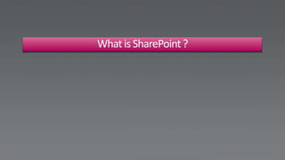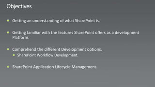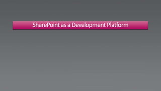 SharePoint is a set of integrated technologies that provides a platform for organizations to build a flexible, long-term information and knowledge management infrastructure. SharePoint has gained over 250 million users in a few years and continues growing as customers apply it to more business processes. SharePoint is also increasingly becoming a compelling development platform with advanced capabilities in the 2010 release.