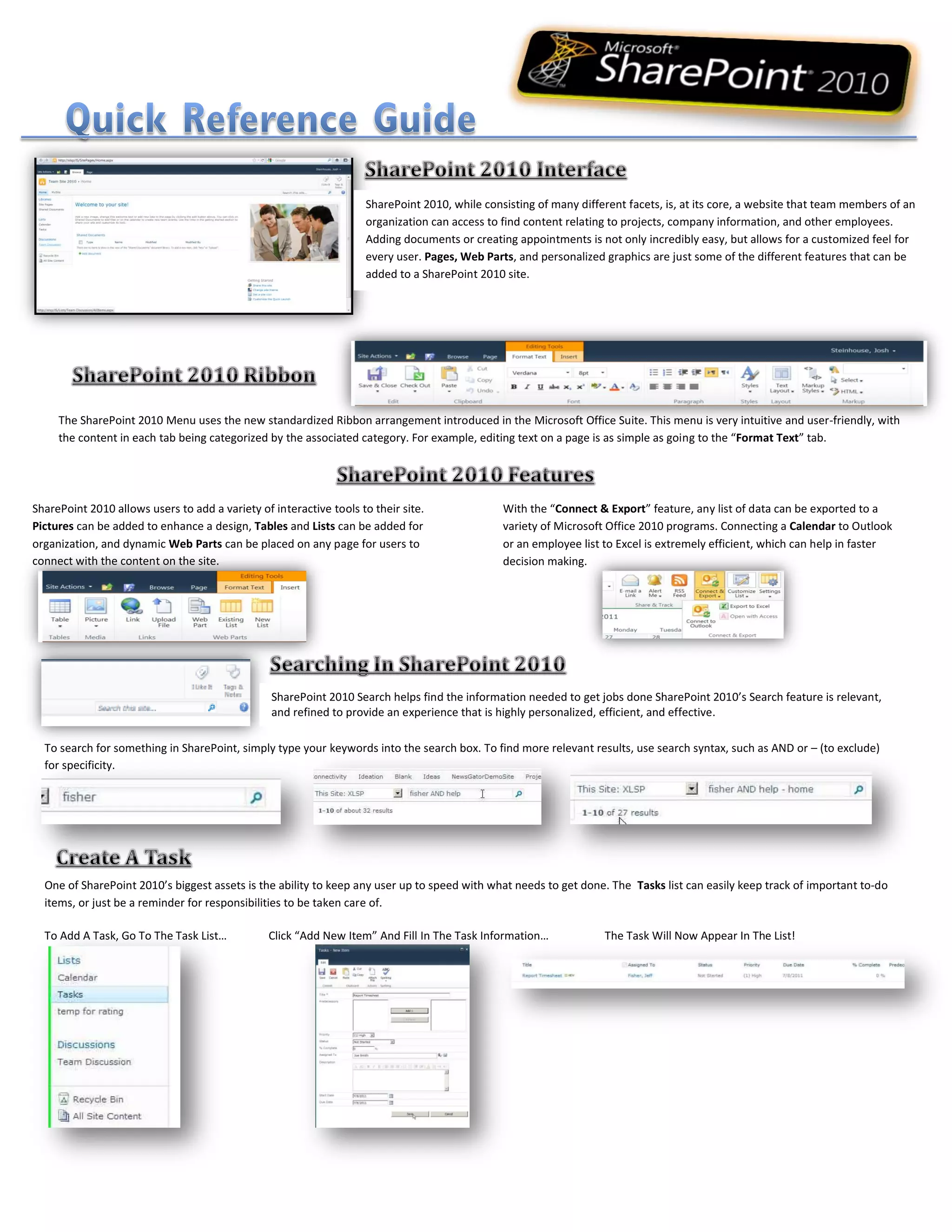 SharePoint 2010 allows users to access content relating to projects and company information from a customizable website. It features an intuitive ribbon menu and allows users to add interactive tools like pictures, tables, and web parts to pages. Documents and files can be uploaded to libraries and edited collaboratively. The My Site feature provides personalized pages where users can view colleagues' profiles, join communities, and see updates in their activity stream.