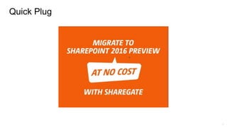 This document announces an event about SharePoint 2016 and provides logistical details. It will include a panel discussion with experts and prizes at 4:10 pm at the Observatory Student Pub on campus, with no need to move cars from parking. Attendees are asked to fill out evaluation forms for a chance to win prizes and to join the Twitter conversation using #spsottawa.