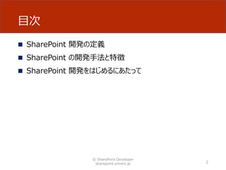 SharePoint の開発手法と特徴 SharePoint 開発をはじめるにあたって 2 © SharePoint Developer sharepoint.orivers.jp