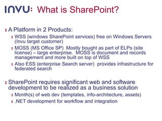 This document discusses SharePoint and Invu software products and how they can work together. It describes SharePoint as a platform for collaboration and building portals that integrate with business systems. Invu is positioned as a document management suite that can take control of business information and work with SharePoint for collaboration, search, and publishing while providing backend workflow and content management capabilities. The document outlines how Invu and SharePoint can be used together for capturing records, pulling documents into secure storage, and updating metadata to share documents on SharePoint portals.