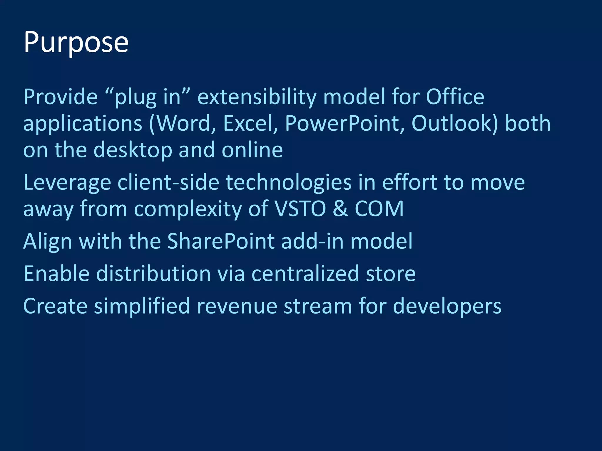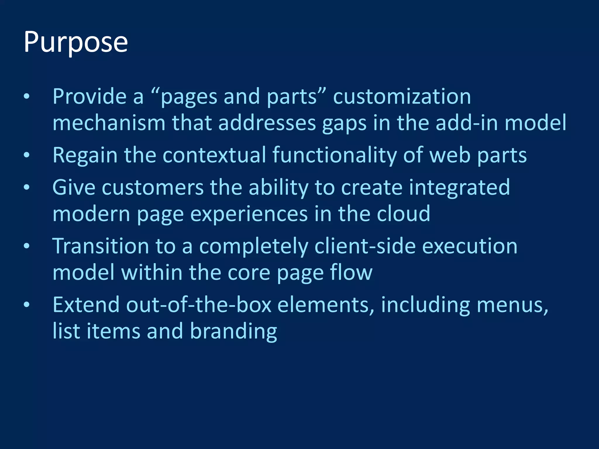 The document provides a comprehensive guide on SharePoint and Office Add-ins development, detailing various models such as provider-hosted and SharePoint-hosted environments. It covers essential topics including security frameworks, deployment processes, and API integrations, emphasizing the use of OAuth for authentication and authorization. Additionally, it discusses the tools and technologies involved in building solutions, including the SharePoint Framework, Azure services, and modern development practices.